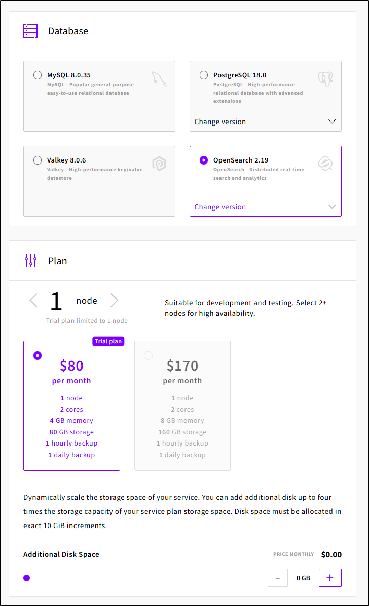 The all have a plan that starts at US$8 a month except for OpenSearch which starts at $80