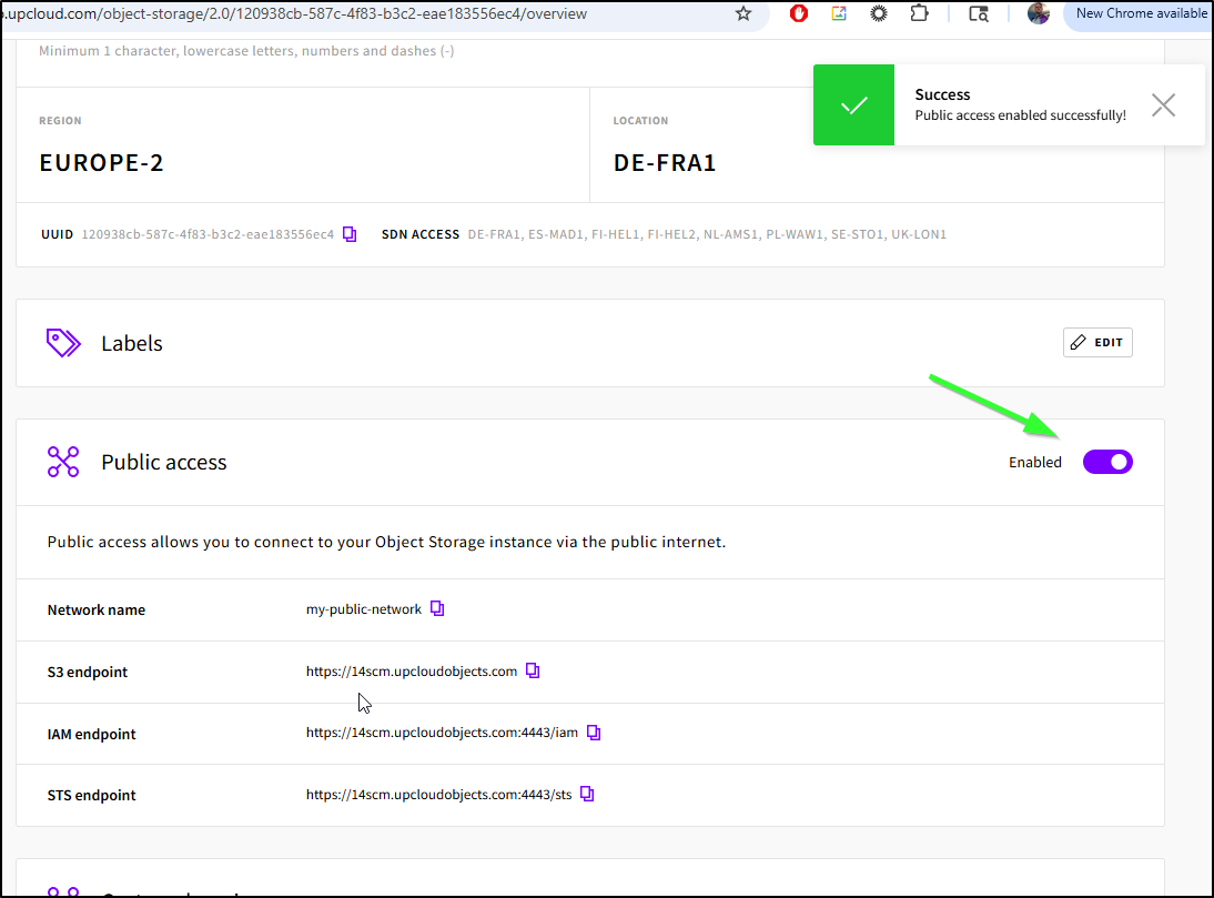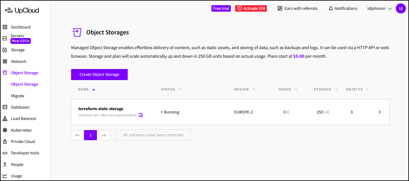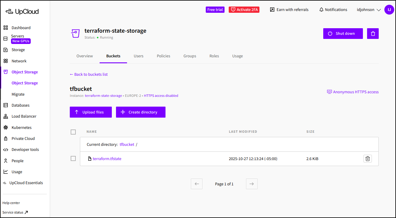 upcloud_managed_object_storage_bucket.tfbucket: Creation complete after 1s [id=120938cb-587c-4f83-b3c2-eae183556ec4/tfbucket]