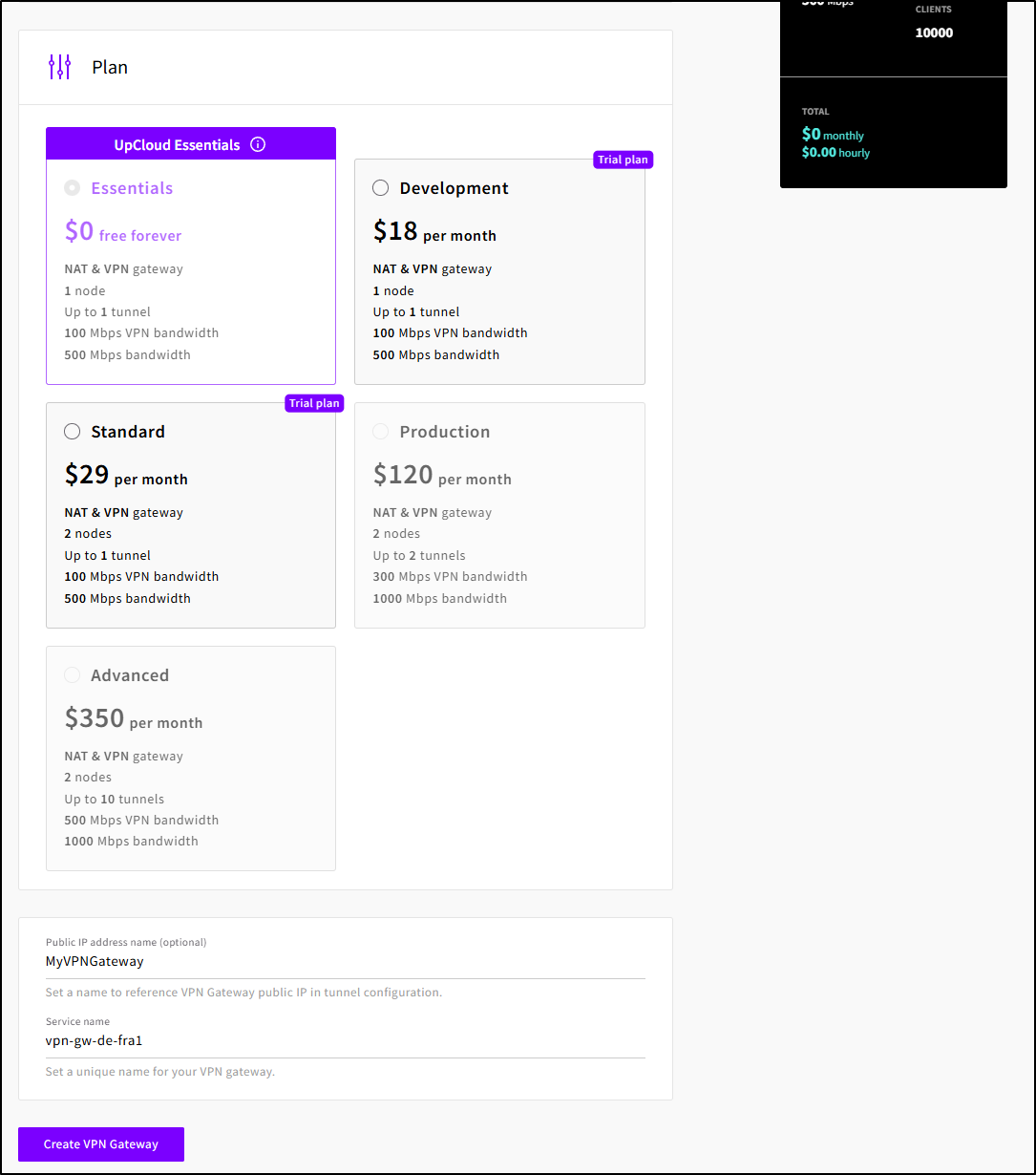 I’ll select a plan (or leave it as the free one) and give my gateway a name, then click “Create VPN Gateway”