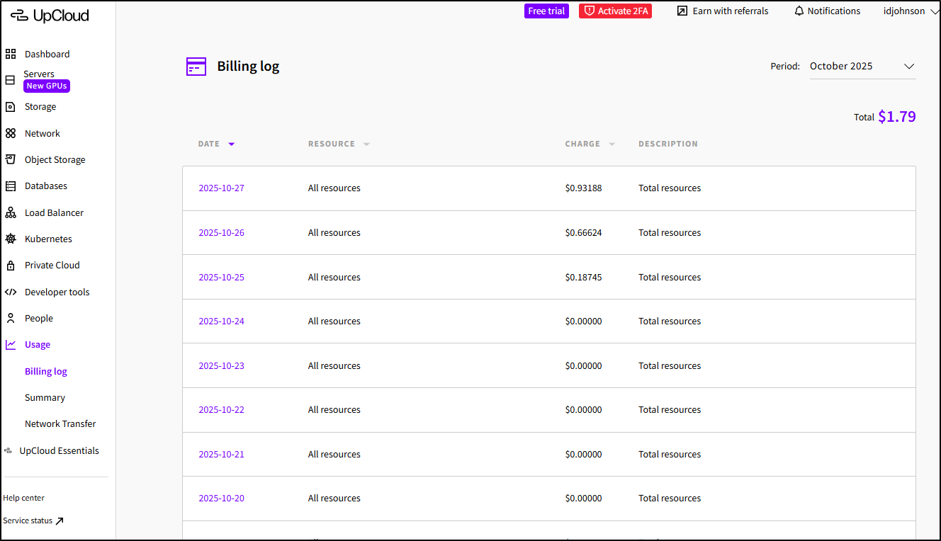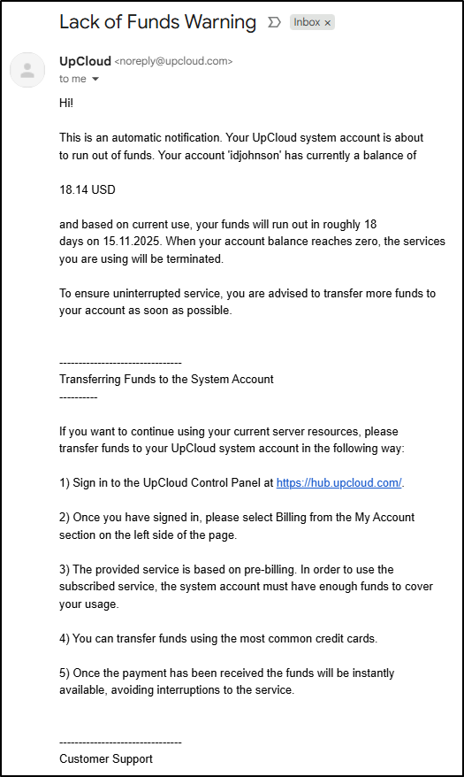 Overall, I really like UpCloud. To make the referral link I had to put real funds in and I noticed that night I got an email saying based on current usage my services would last roughly 18days