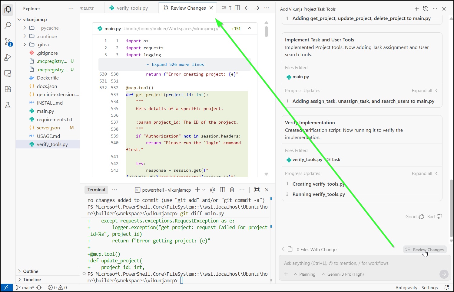 I used git diff to see the changes in the terminal, as is my habit, but we can see there is a “review changes” button I could have used to see them in the IDE