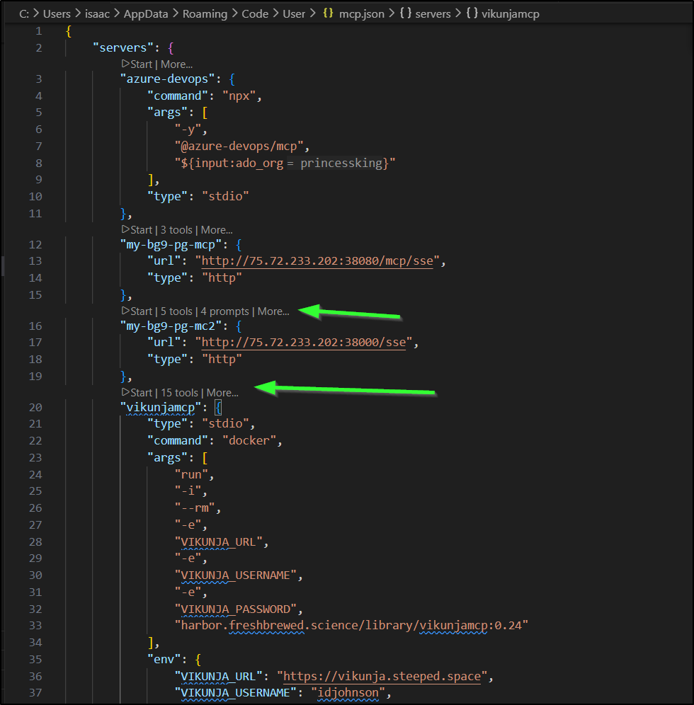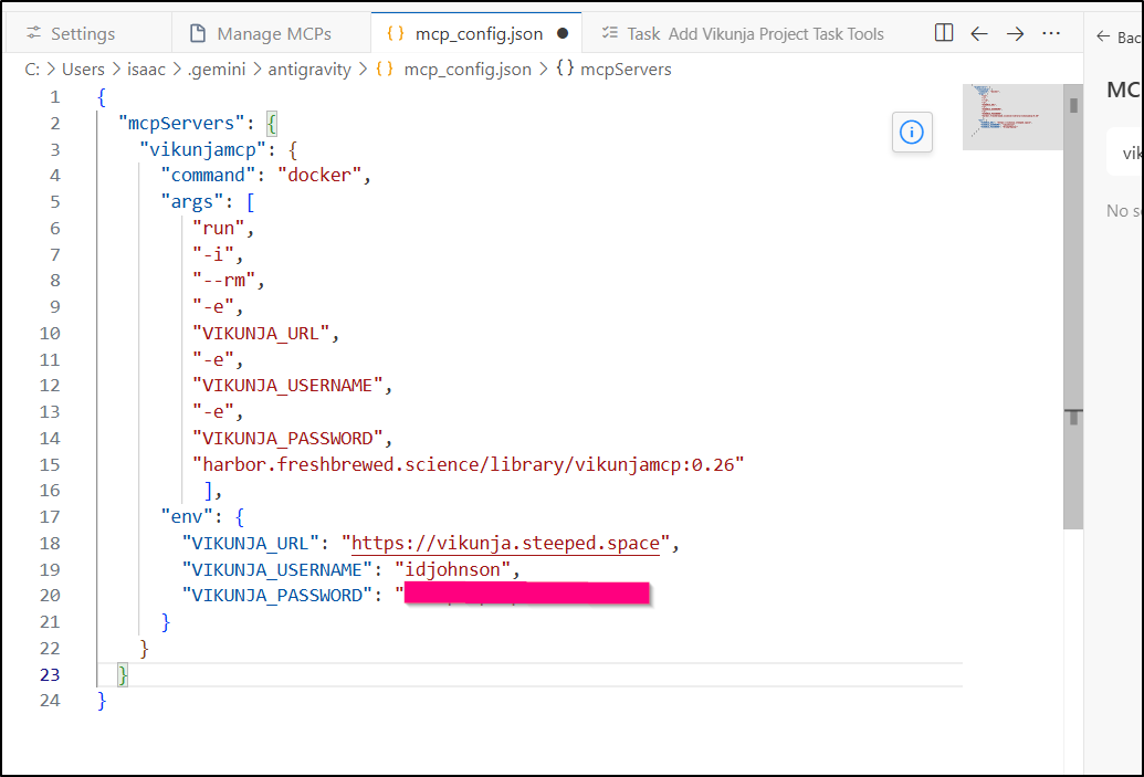 Because my Vikunja MCP server is stdio via Docker, I should be able to just add a new block with the filled in secrets