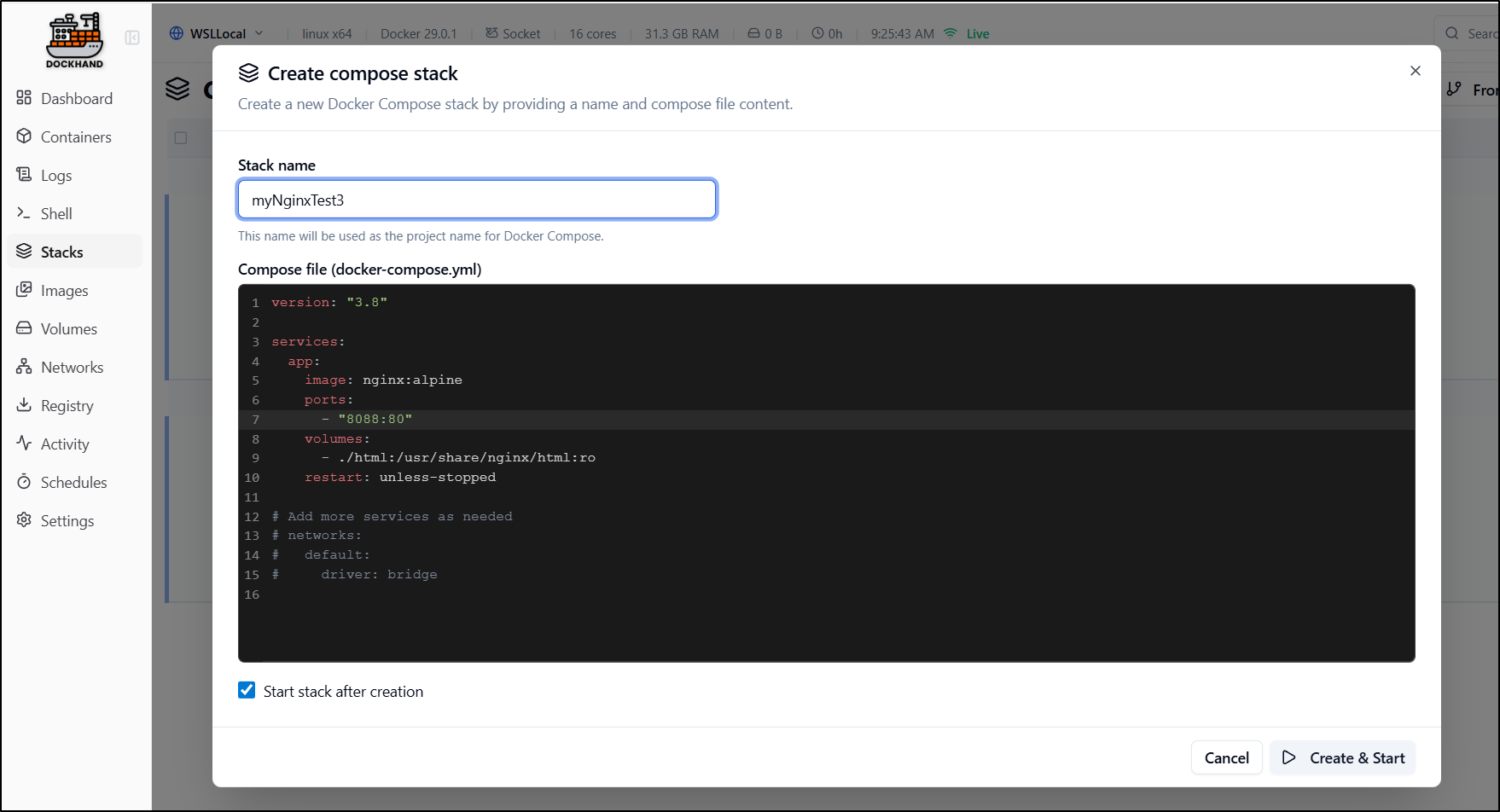 We can “create” a stack here. I will test my luck and do Nginx again with a port mapping