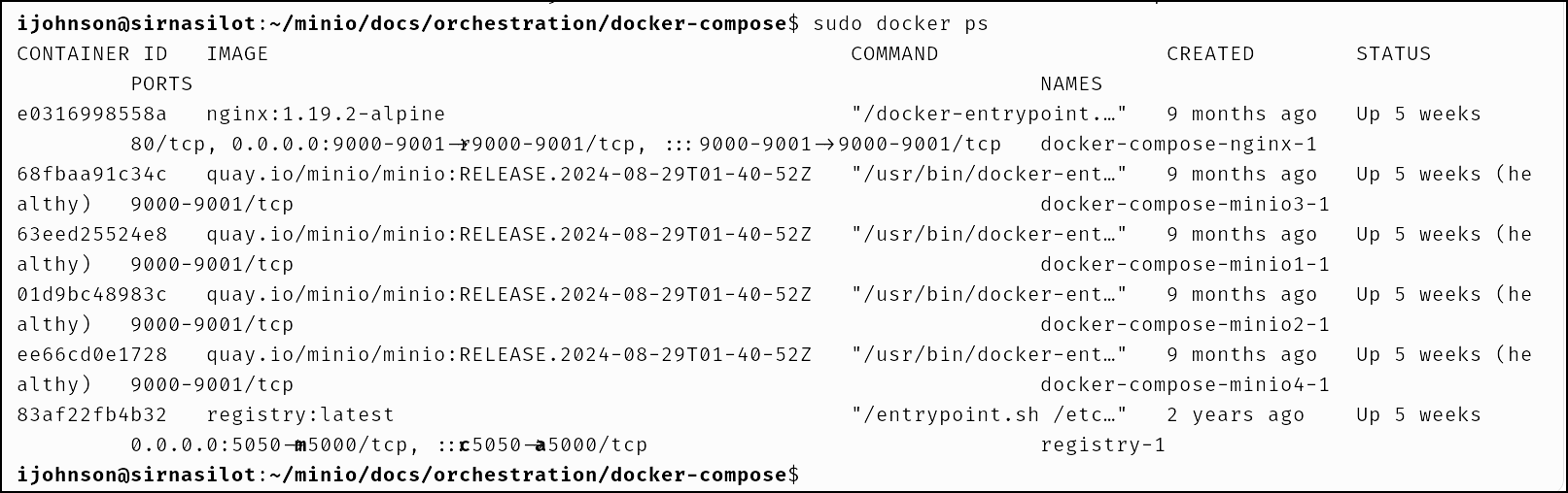 ijohnson@sirnasilot:~/minio/docs/orchestration/docker-compose$ cat docker-compose.yaml