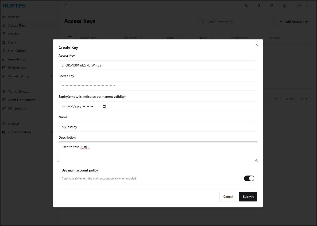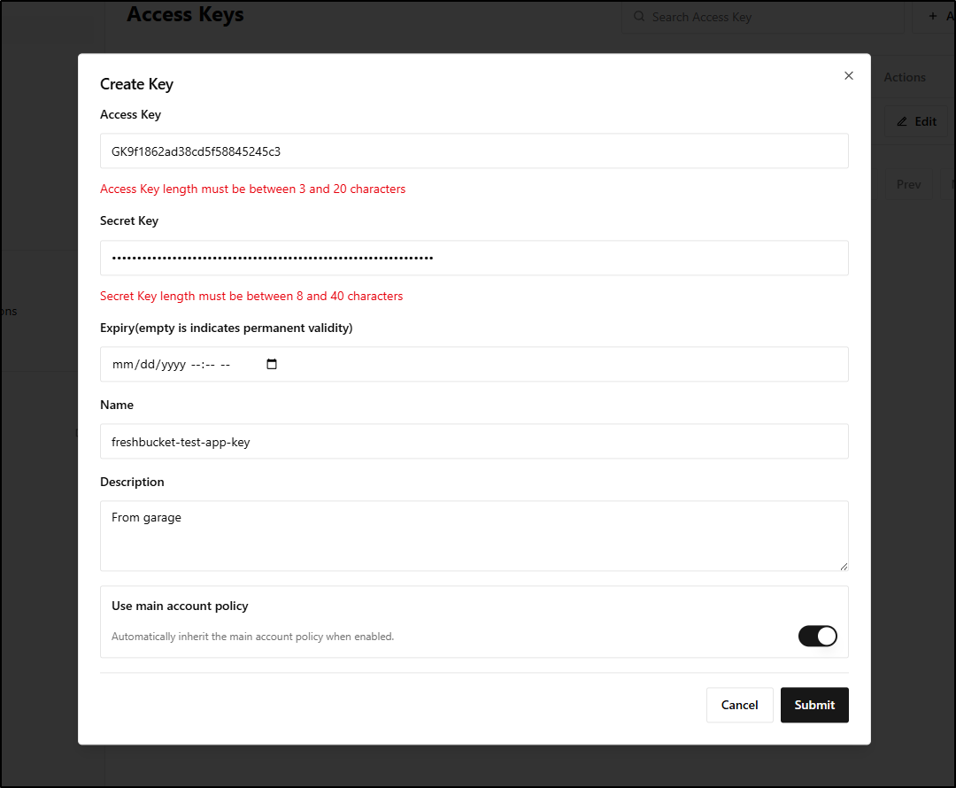 Maybe I could use the Garage key in RustFS. Unfortunately, they have different size requirements.
