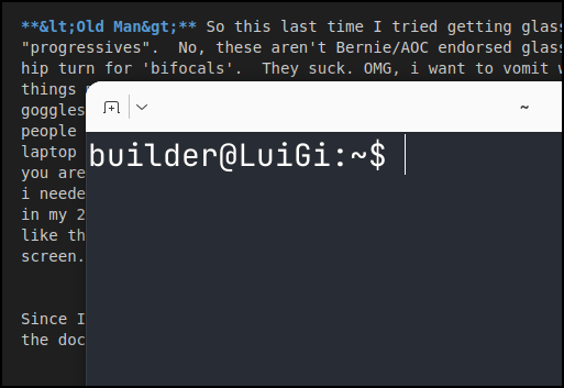 <Old Man> So this last time I tried getting glasses they offered me “progressives”. No, these aren’t Bernie/AOC endorsed glasses, they are the hip term for ‘bifocals’. They suck. OMG, i want to vomit wearing them. the things move in different speeds at the bottom half giving you a “drunk goggles” view. So i refuse to wear them. So now I wear cheaters (what old people call reading glasses) when in bed and otherwise i just hold the phone/laptop out. You don’t really lose your near sight focus till your 40s so if you are younger, enjoy that sh** while you have it. I wish I would have known I needed to periodically use my close up vision or i would lose it when i was in my 20s and 30s. In any case, yes, old man keeps yammering.. in any case, I like this font way better for when I’m using the higher resolution 4k laptop screen… </Old Man>