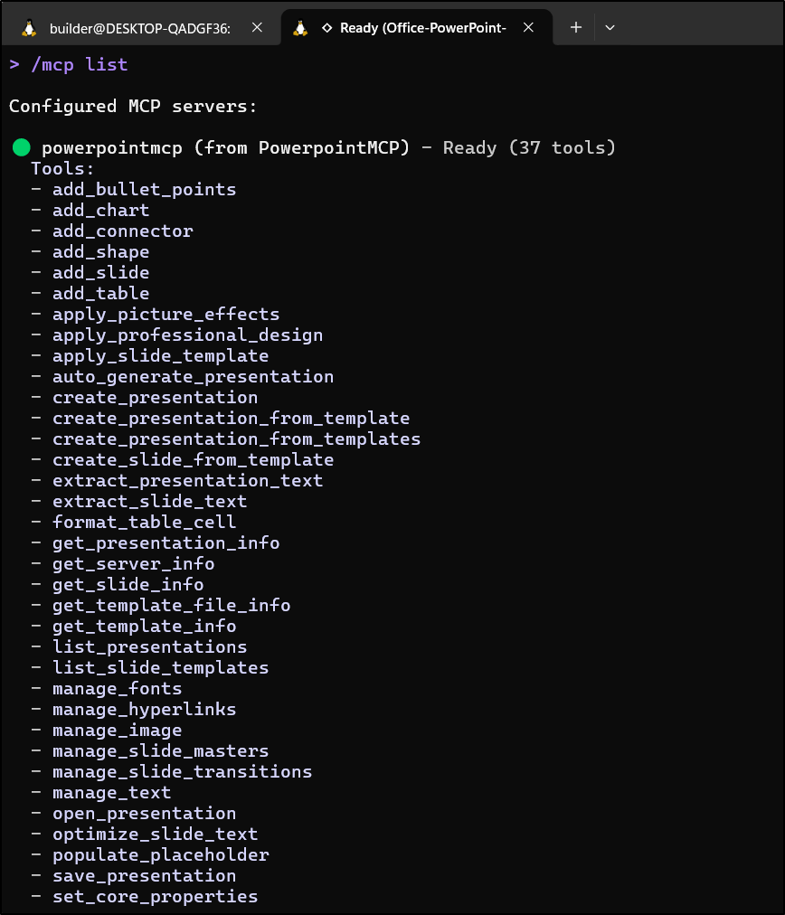 I also went and added the PowerPoint MCP server (gemini mcp add PowerpointMCP /home/builder/Workspaces/Office-PowerPoint-MCP-Server/venv/bin/python /home/builder/Workspaces/Office-PowerPoint-MCP-Server/ppt_mcp_server.py) so we could test both