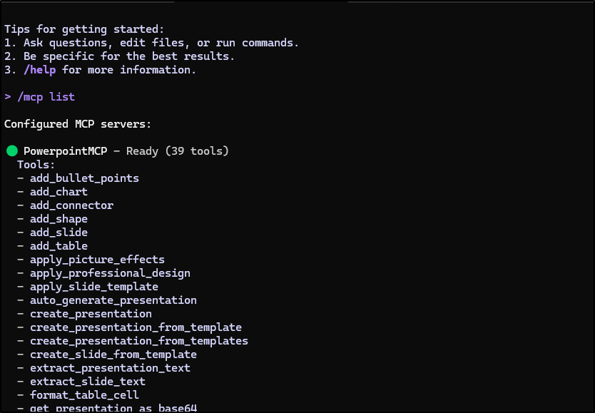 As you recall form earlier, we simply added the Office PowerPoint MCP server using: gemini mcp add PowerpointMCP /home/builder/Workspaces/Office-PowerPoint-MCP-Server/venv/bin/python /home/builder/Workspaces/Office-PowerPoint-MCP-Server/ppt_mcp_server.py