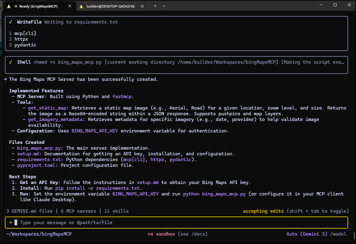 (venv) builder@LuiGi:~/Workspaces/bingMapsMCP$ gemini mcp add \