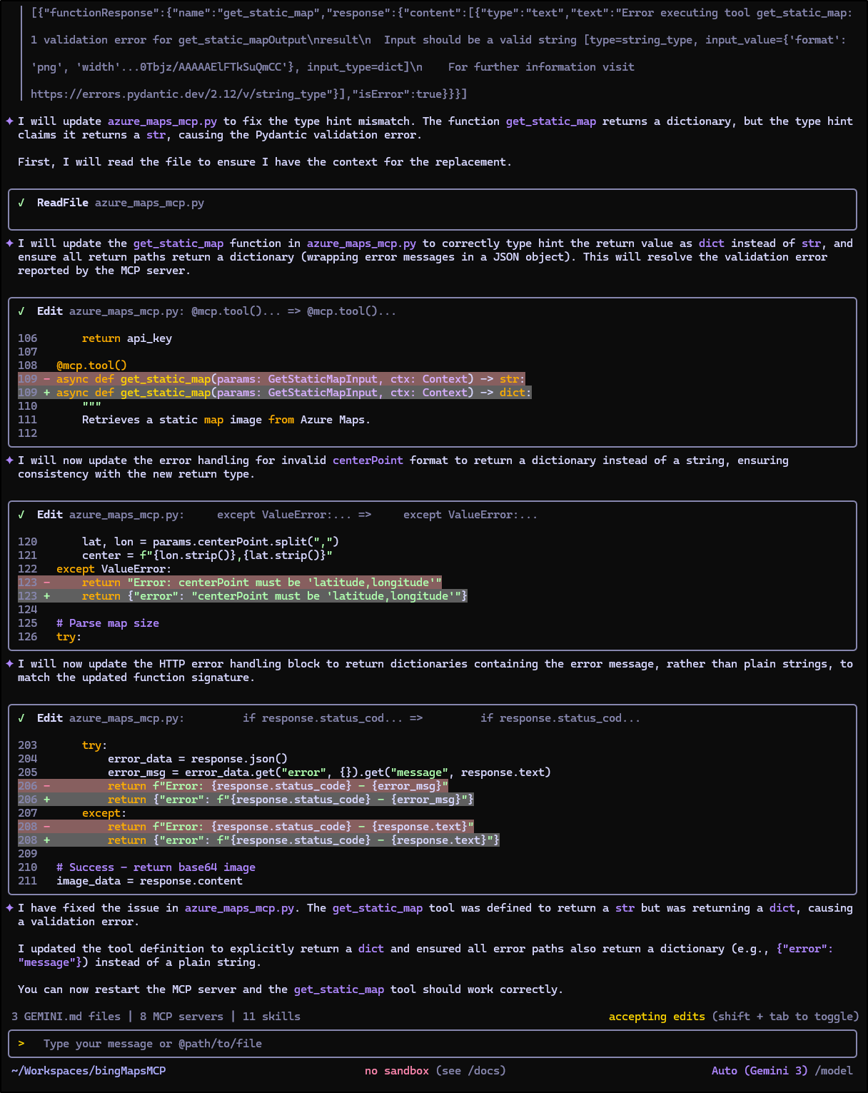 I still wanted my MCP server to work, so I then had Gemini work against the error to correct