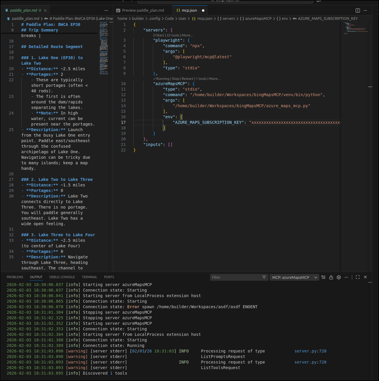 In making a BWCA route, I found the general “create a map” or image from Nanobanana was rather pointless - they bared no resemblance to the lakes in question. This brought me to a Google Maps MCP server which did a fantastic job. Yes, it took a bit of legwork to create a proper Service account with permissions, but it was worth it for the proper images.