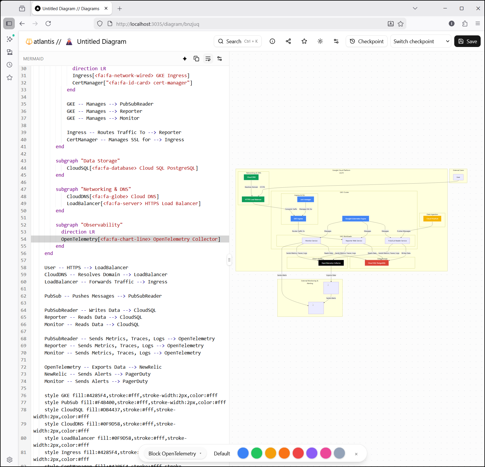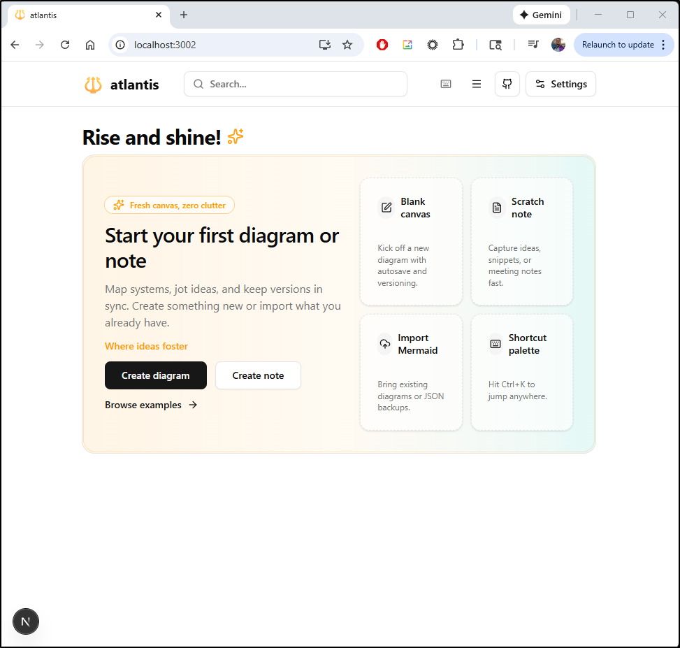 Today we fired up Atlantis from StrikeCode/FCM. There was clearly some issues with the “latest” on the day I tested, but we found the prior label was quite stable (and did get latest to ultimately run). I kept it in docker for now, but found it was stable and got the job done. I was particularly impressed with the “AI” features (which now gives Mermaid.live a good locally hosted competitor)