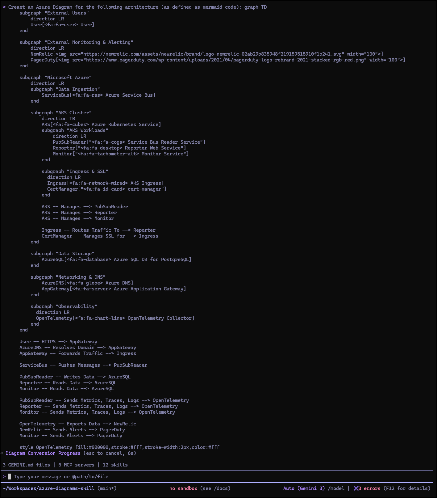 Carl Bindle posted a new Azure Diagrams skill to my LinkedIn feed. So let’s see how it works in Gemini CLI and Copilot (and perhaps compare to Atlantis or used in conjunction with Atlantis).