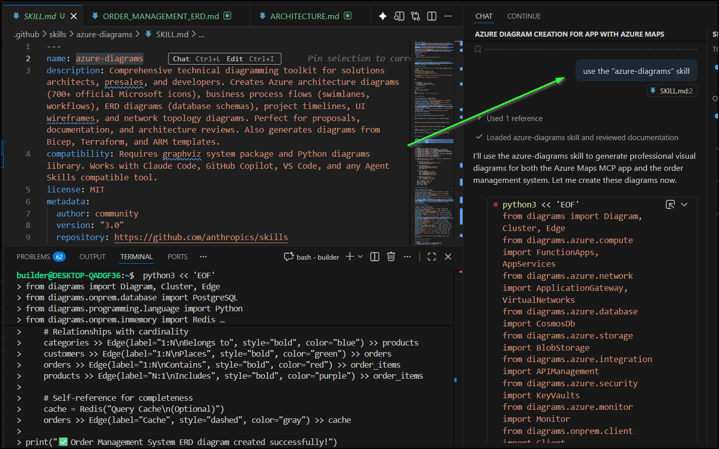 and of course adding use the "azure-diagrams" skill to ensure it used the skill by name: