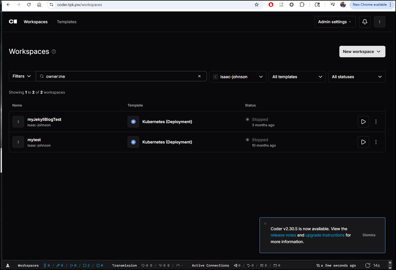 Today we circled back on Coder and upgrading my local Kubernetes based instance with helm. This initially didn’t go well, but what was really going on was my primary control plane server was acting up and ultimately I needed to reboot it. After a reboot, most of my services in Kubernetes started to behave again including Coder.