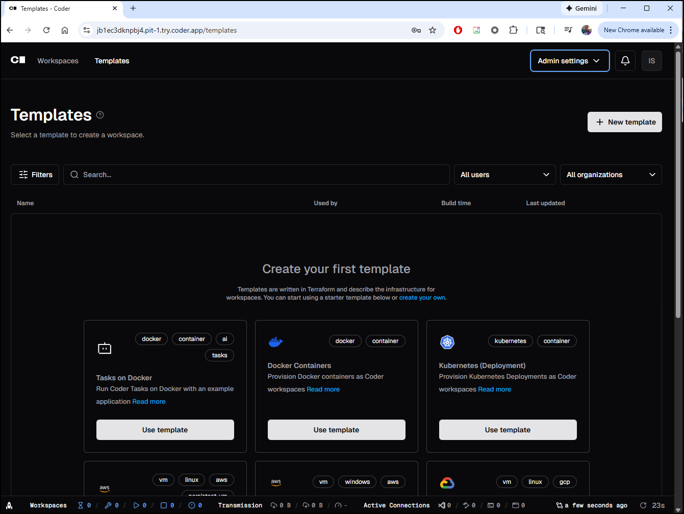 I came back after a day (as the cluster control plane was misbehaving and I didn’t want to assume this was Coder’s fault)