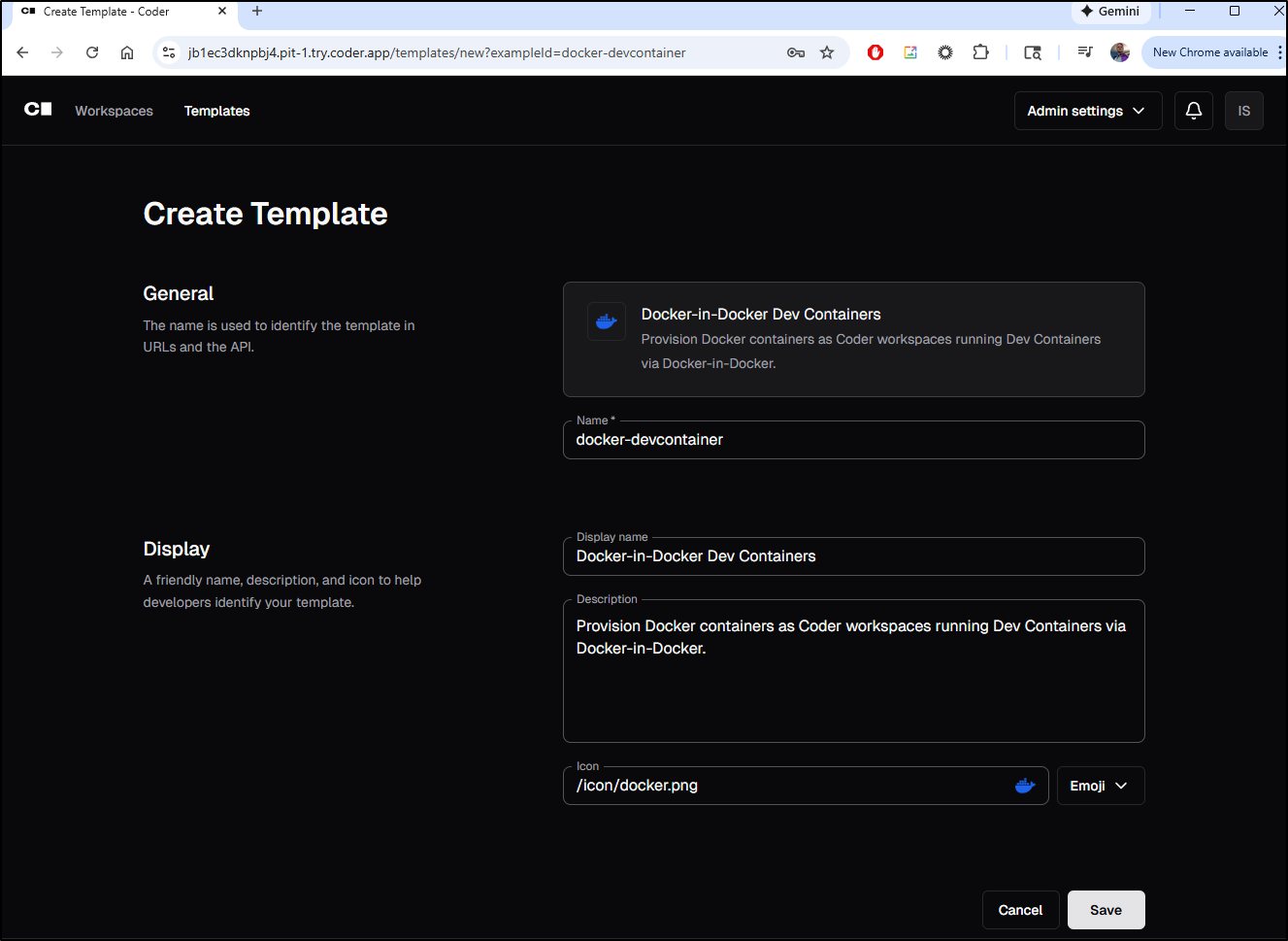 While the DinD didn’t give me a code server, i tried adding the Docker Container one (not Docker in Docker), then using that for a new workspace