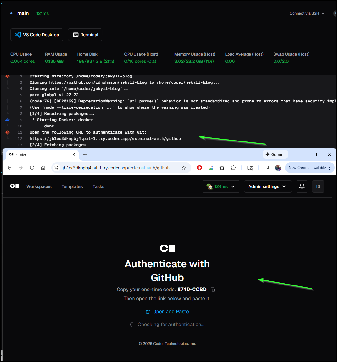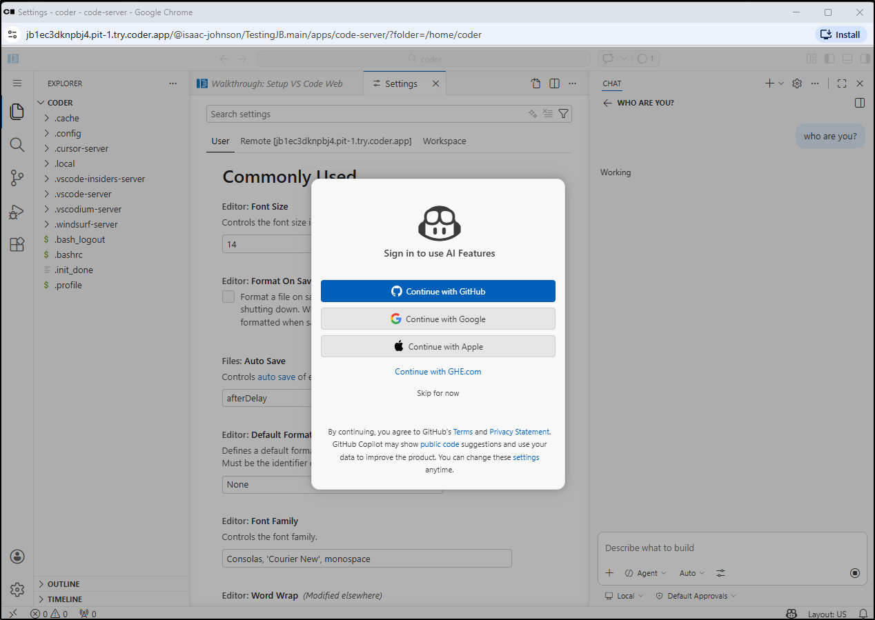 I also explored running Coder natively on a Linux host. When one does it this way, there is a reverse proxy created on coder.app. We then connected there to create a new user and attempted to Auth to Github, but could not solve private repo access that way. However, we easily setup Docker-in-Docker as well Docker based containers using the Continue.dev plug for LLM usage against local infrastructure. Lastly, we saved our code out in a private Forgejo repository.