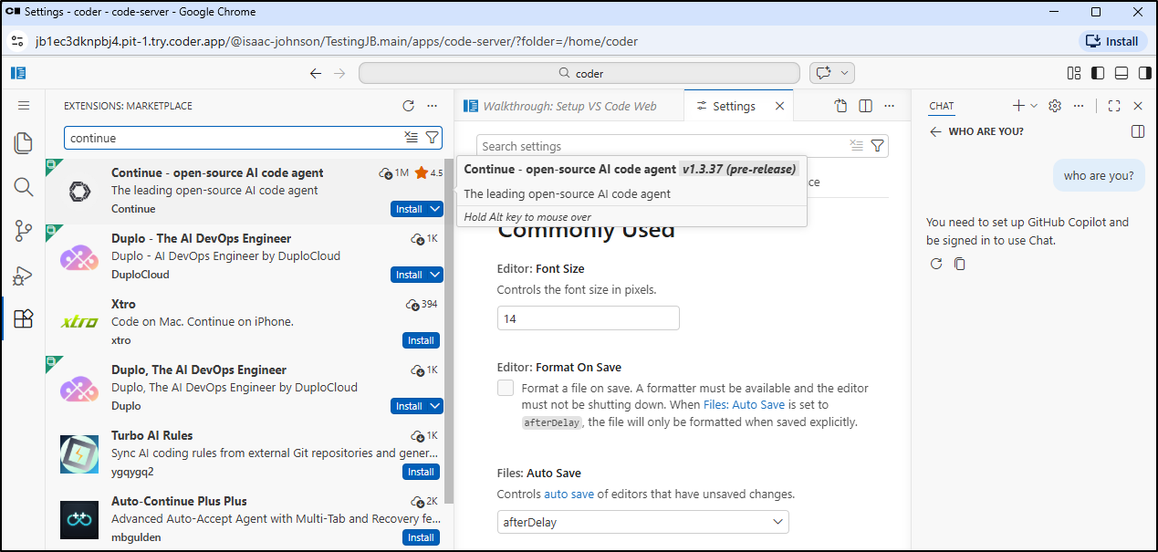 That fired up with a Code server. I can see we can use Github Copilot