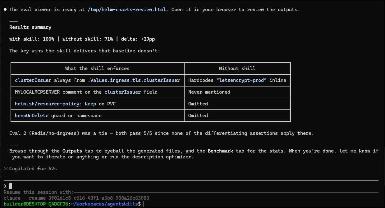 The behavior of Claude code was to kick out up to 6 agents to do things, then come back and another 6 agents to evaluate and judge the work. The output in the end was fine, but it also wasn’t particularly fast. I found the time I spent building out the helm chart skill with Claude Code was about the same as it was building perl app skill. The quality might be better with helm but at what price?