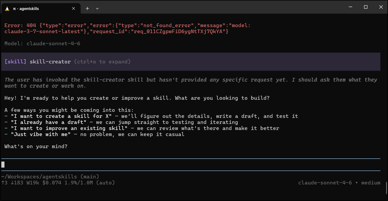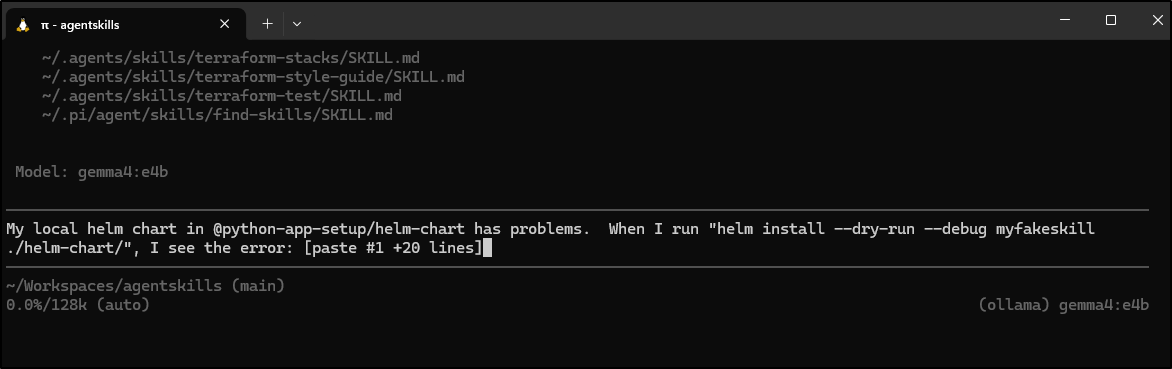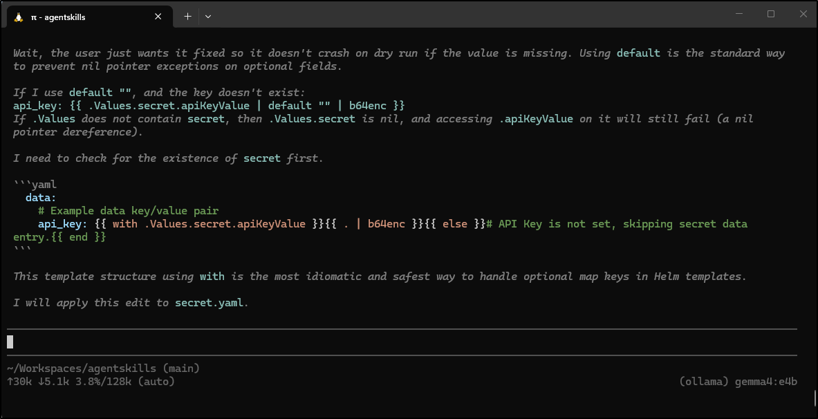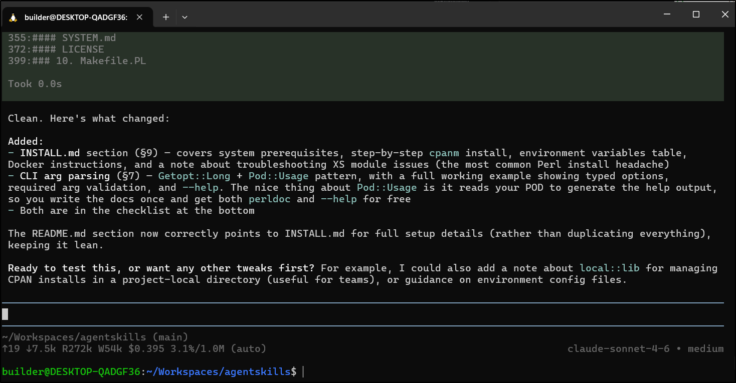 I spent about US$0.35 making the Perl skill and about US$2.30 with Claude Code making the helm chart one. Both used the Anthropic “skill builder” skill. Assuming the quality is similar, I might use Pi from here on out. However, as a “free tier” user that pays per token, the money factor might really be my underlying driver.