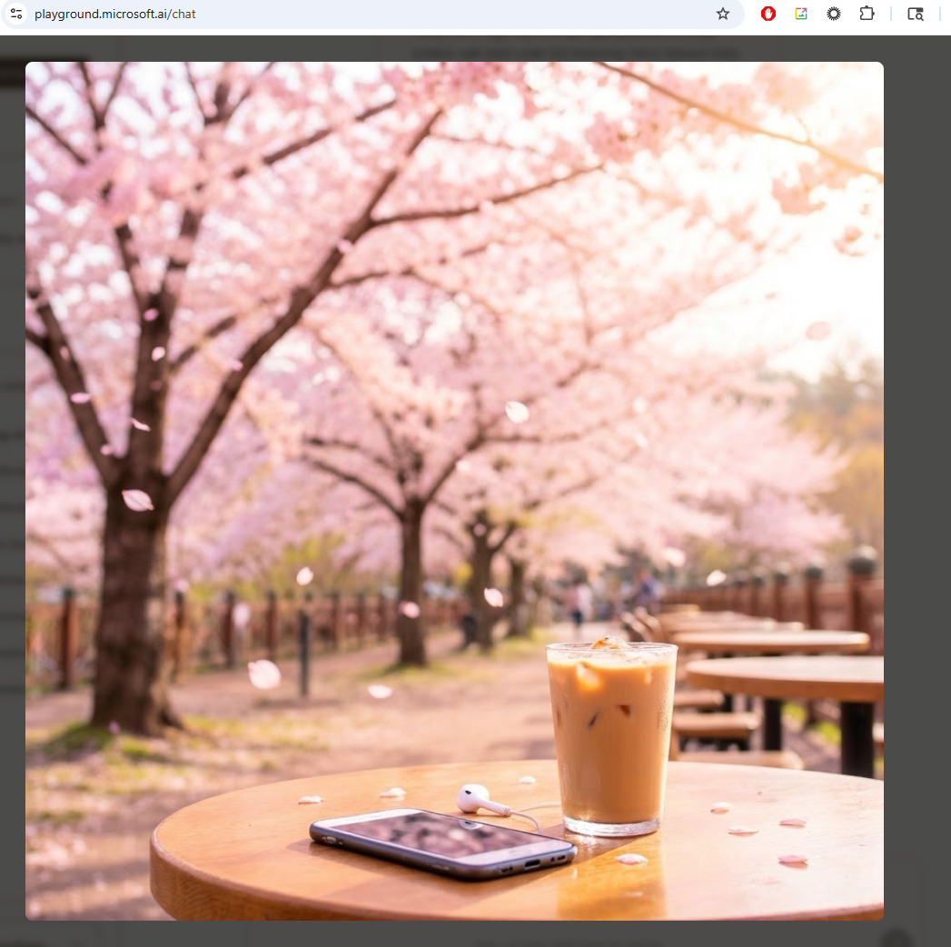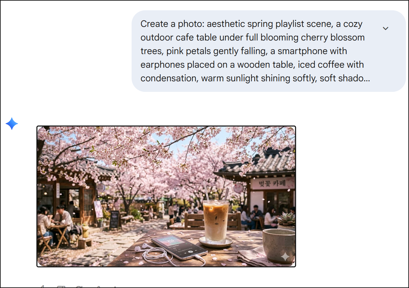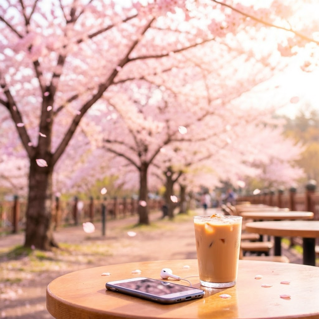 aesthetic spring playlist scene, a cozy outdoor cafe table under full blooming cherry blossom trees, pink petals gently falling, a smartphone with earphones placed on a wooden table, iced coffee with condensation, warm sunlight shining softly, soft shadow, dreamy and romantic mood, pastel color tones, ultra realistic, cinematic lighting, shallow depth of field, natural composition, Korean spring vibe, 50mm lens, high detail, bokeh background