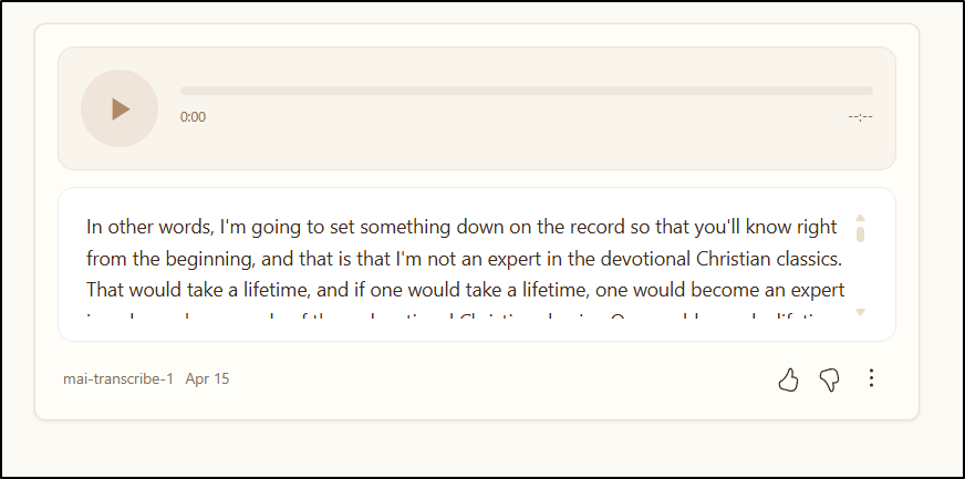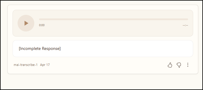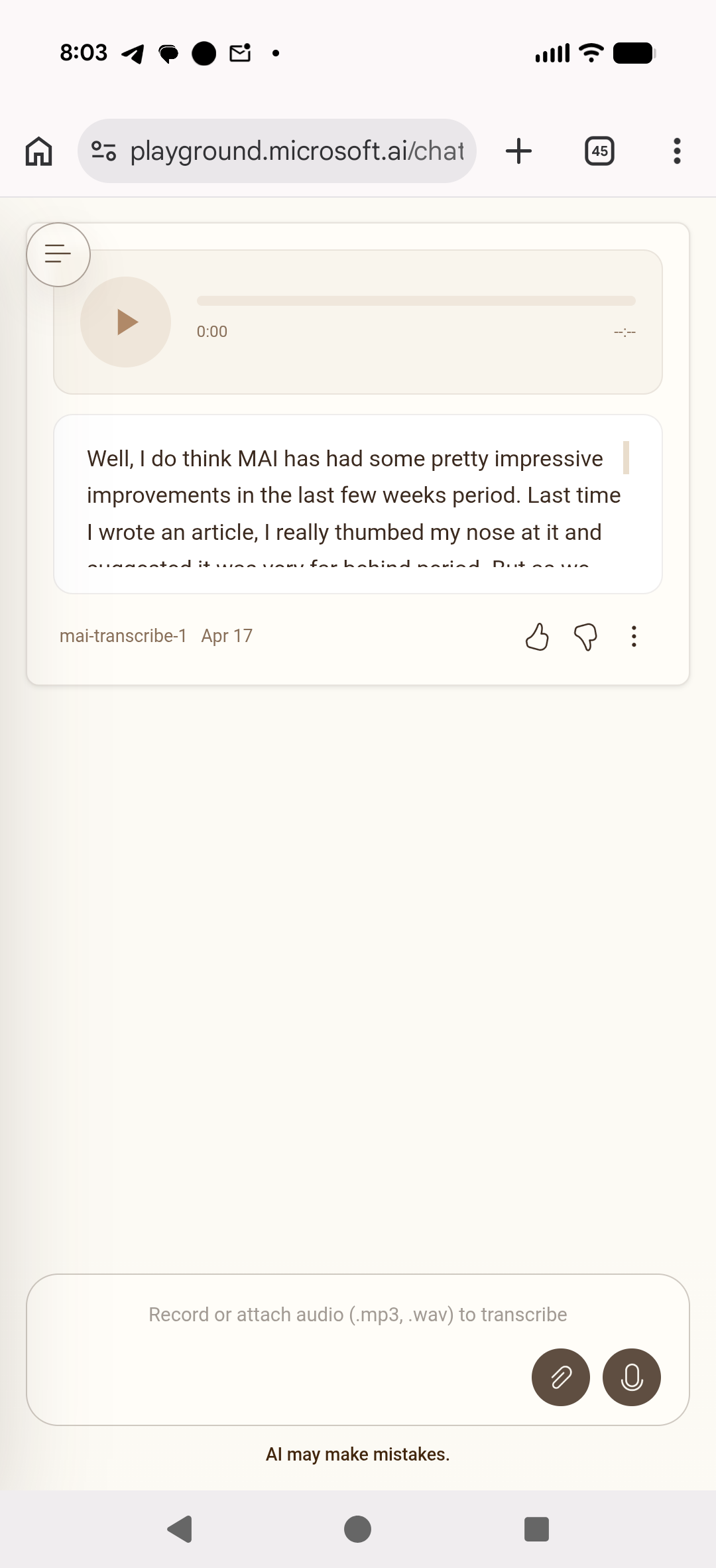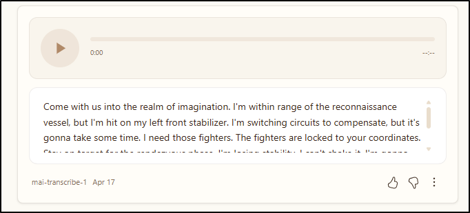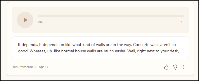 The voice creation, the text to voice is okay. And the image model has greatly improved, if for no other reason, diagrams are actually usable period. I think going forward, I will regularly check back on the MAI playground and see if it’s improved at all period. My final test here is using a Android app that’s a voice recorder to record this summary and transcribe it. We’ll see how it goes.