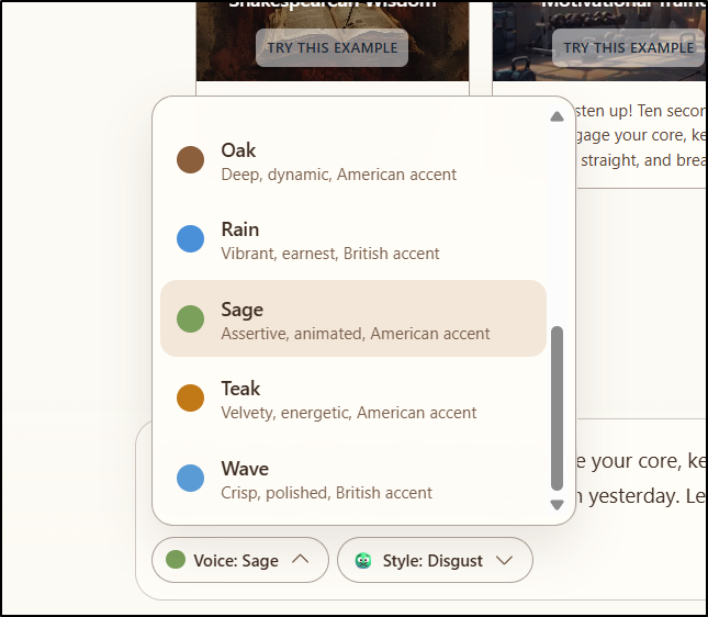 The Voice generator has quite a few styles that roughly translate to emotions