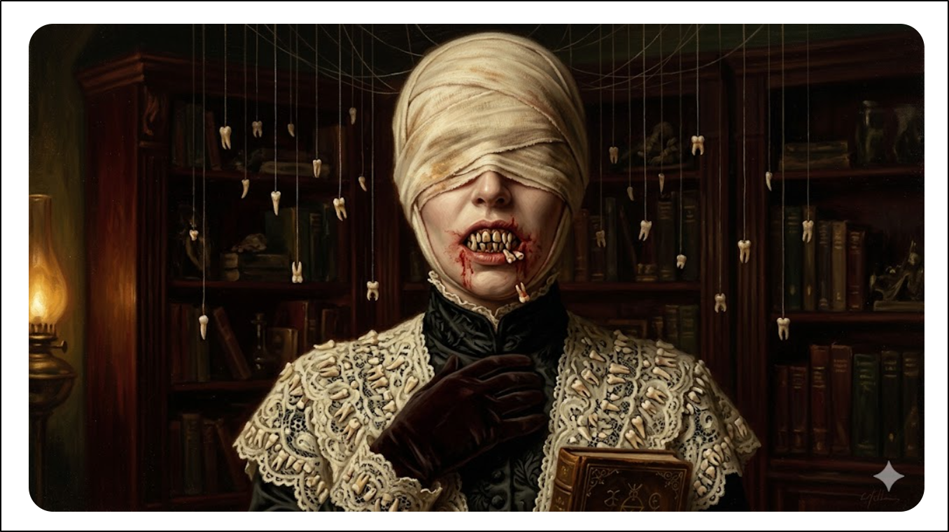 Photorealistic painting of a Victorian woman with the upper half of her head wrapped in bandages. The lower half of her face reveals a mouth full of monstrous teeth that are falling out. Numerous other teeth hang from above on threads. Red liquid stains around mouth. Insanely intricately detailed white fabric clothing decorated with teeth. Dramatic lighting. Esoteric, horror, creepy, unsettling, disorienting, dreamcore. Surreal