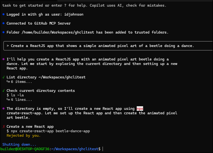 builder@DESKTOP-QADGF36:~/Workspaces/ghclitest$ npm install -g @github/copilot