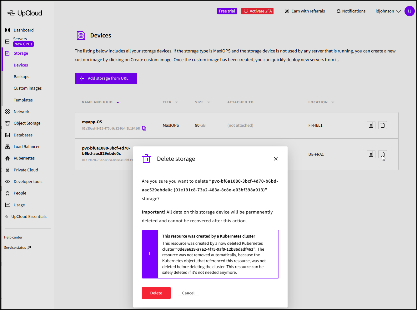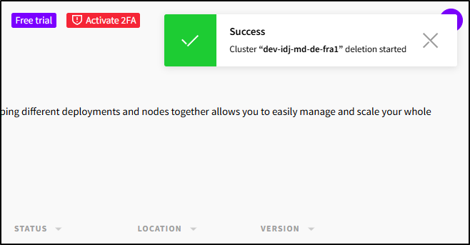 I get a pop-up saying cluster deletion has started