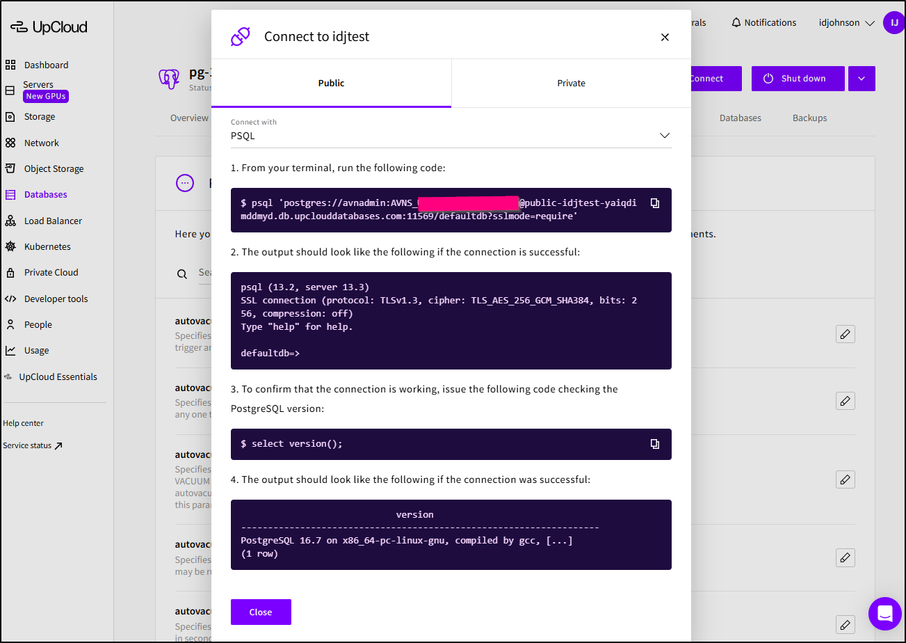 $ psql 'postgres://avnadmin:asdfasfasdfsadf@public-idjtest-yaiqdimddmyd.db.upclouddatabases.com:11569/defaultdb?sslmode=require'
