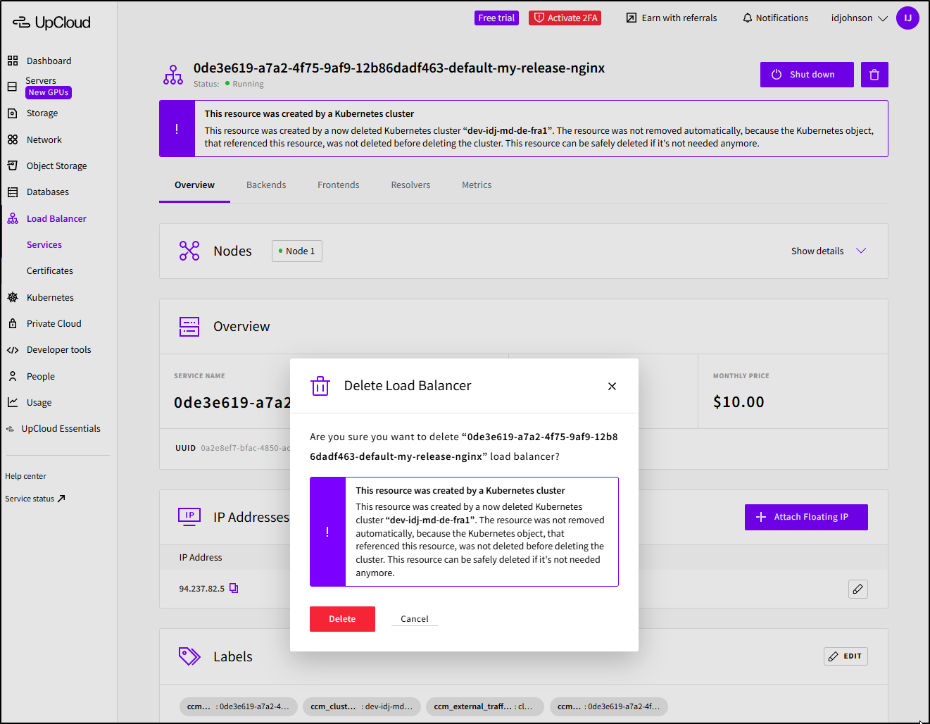 Later in the day I checked back on the Load Balancers - was the Nginx one deleted?