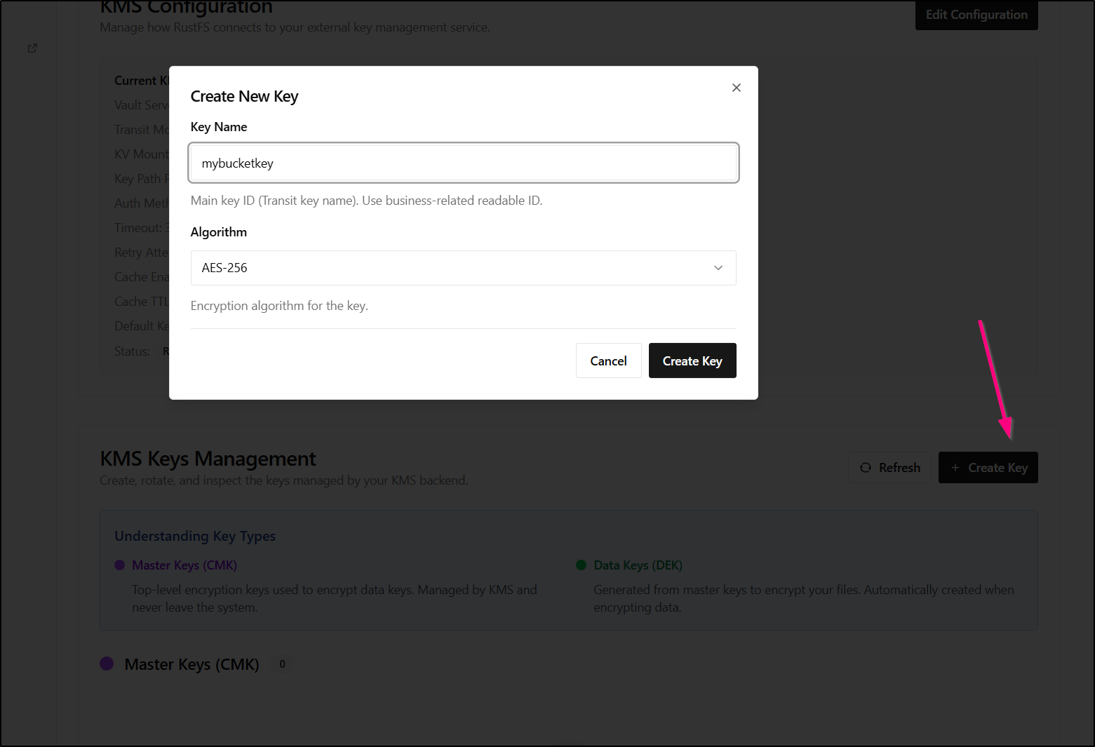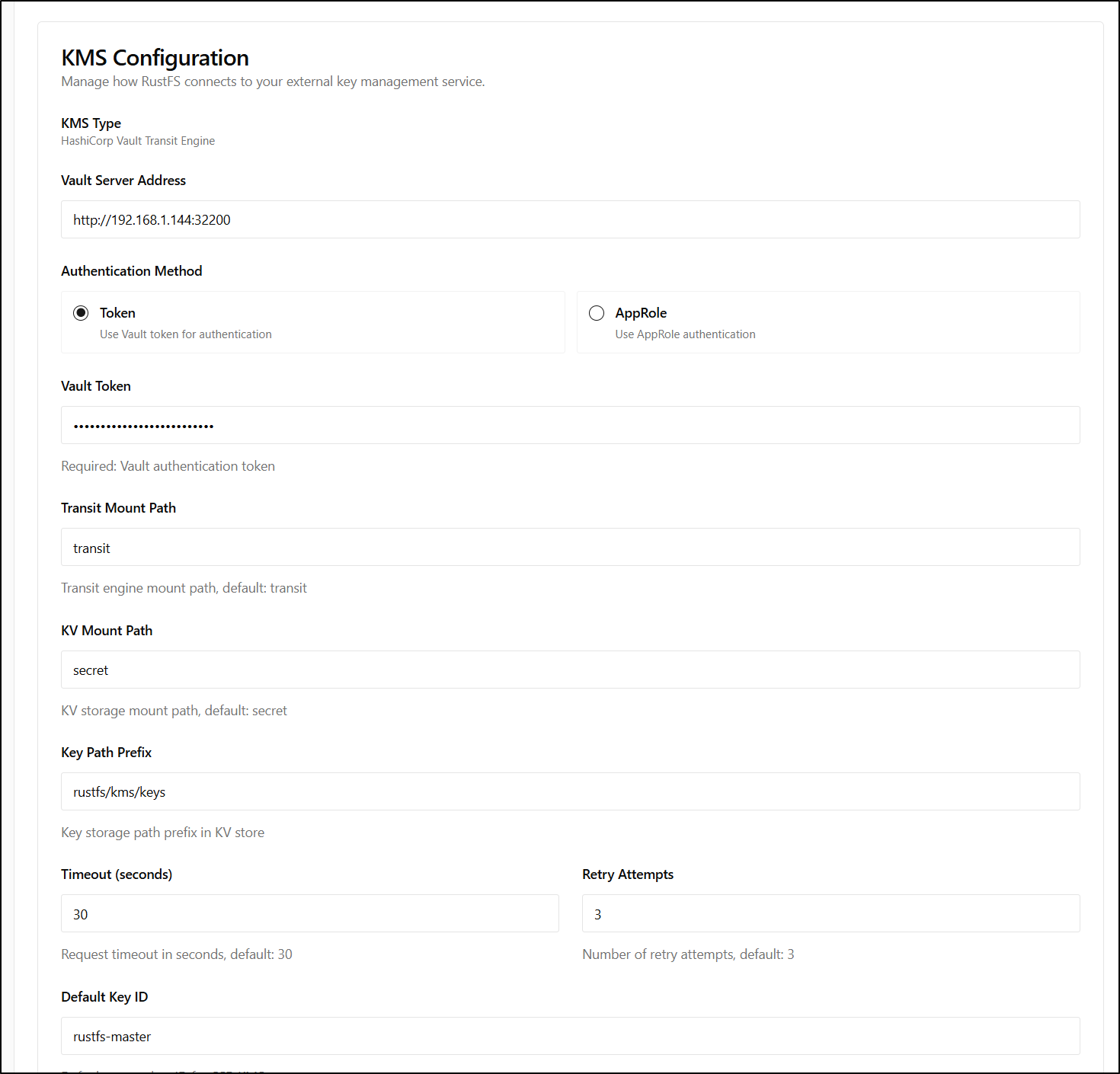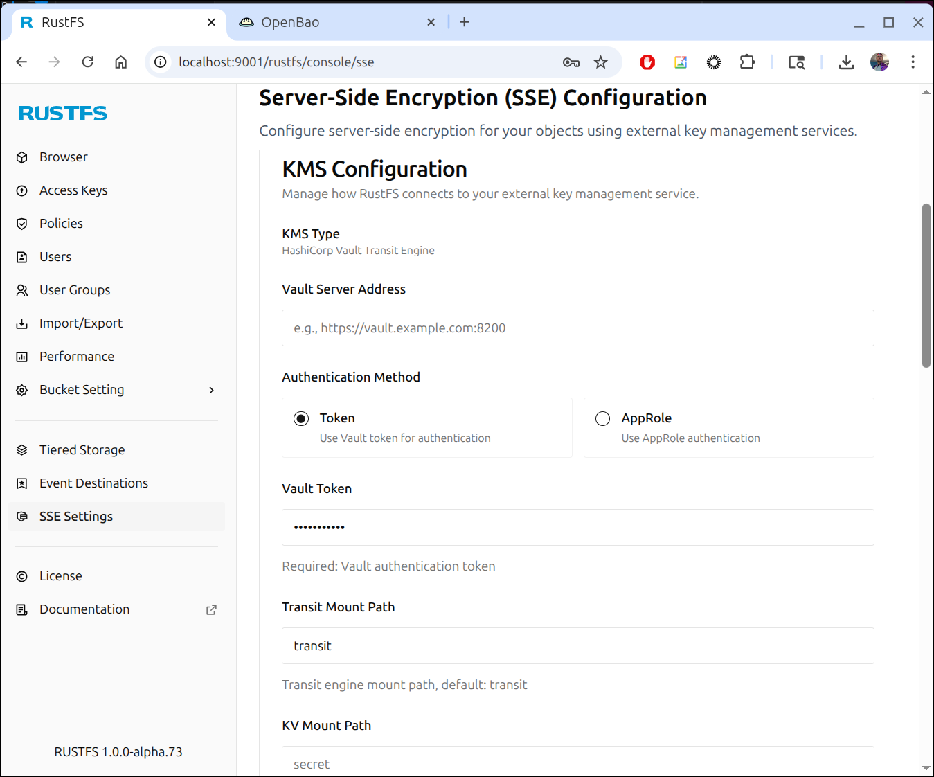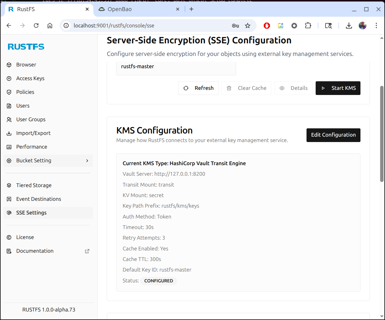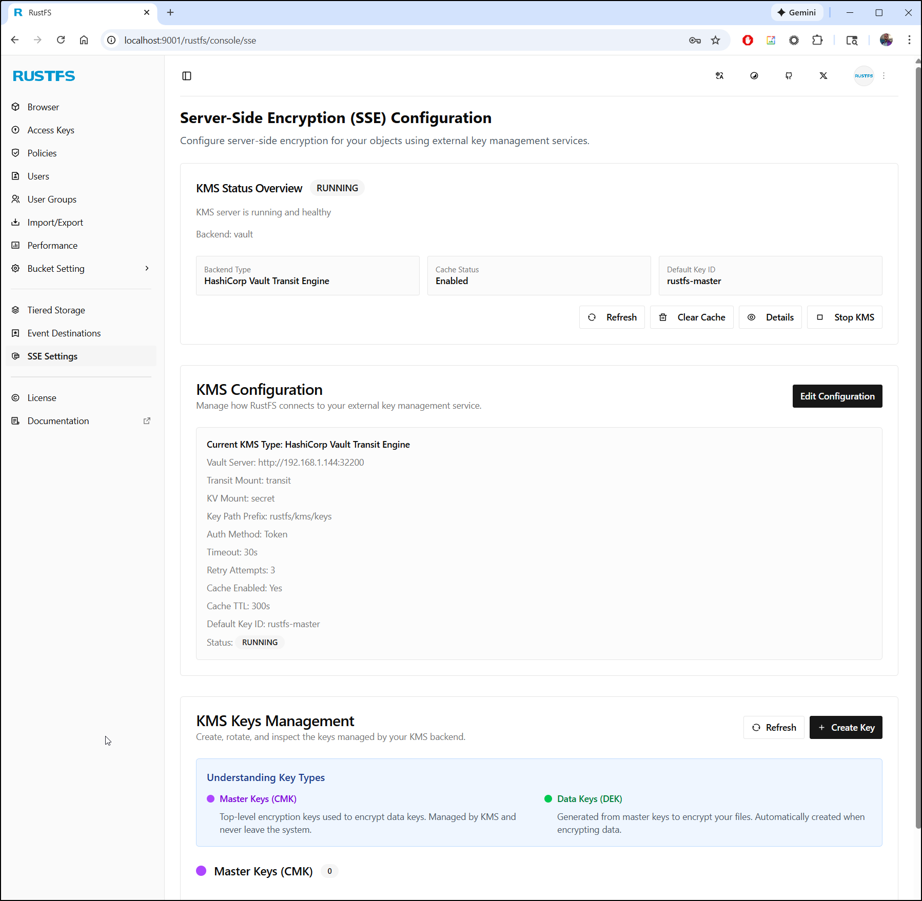 Also, the docs for rustfs mentioned a few KMS’es we could use like AWS and Azure AKV but I see no such options locally.
