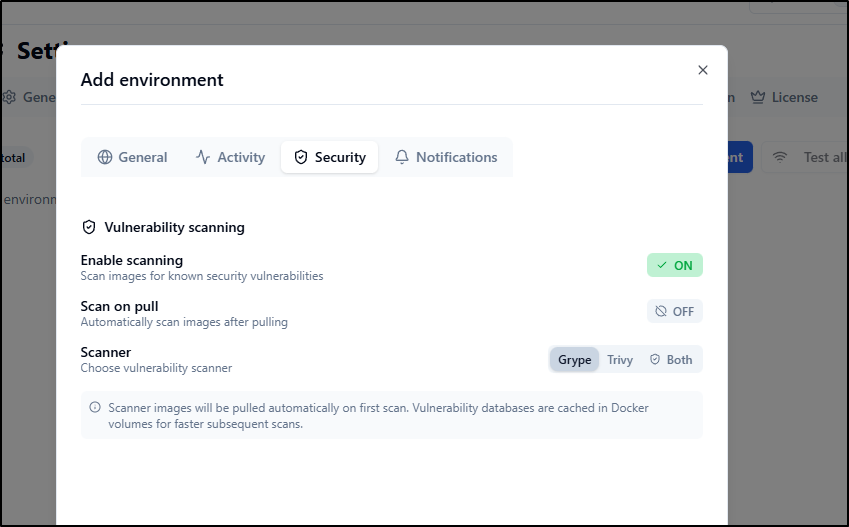 I can enable container scanning on pull and pick the scanner to use (by default off)