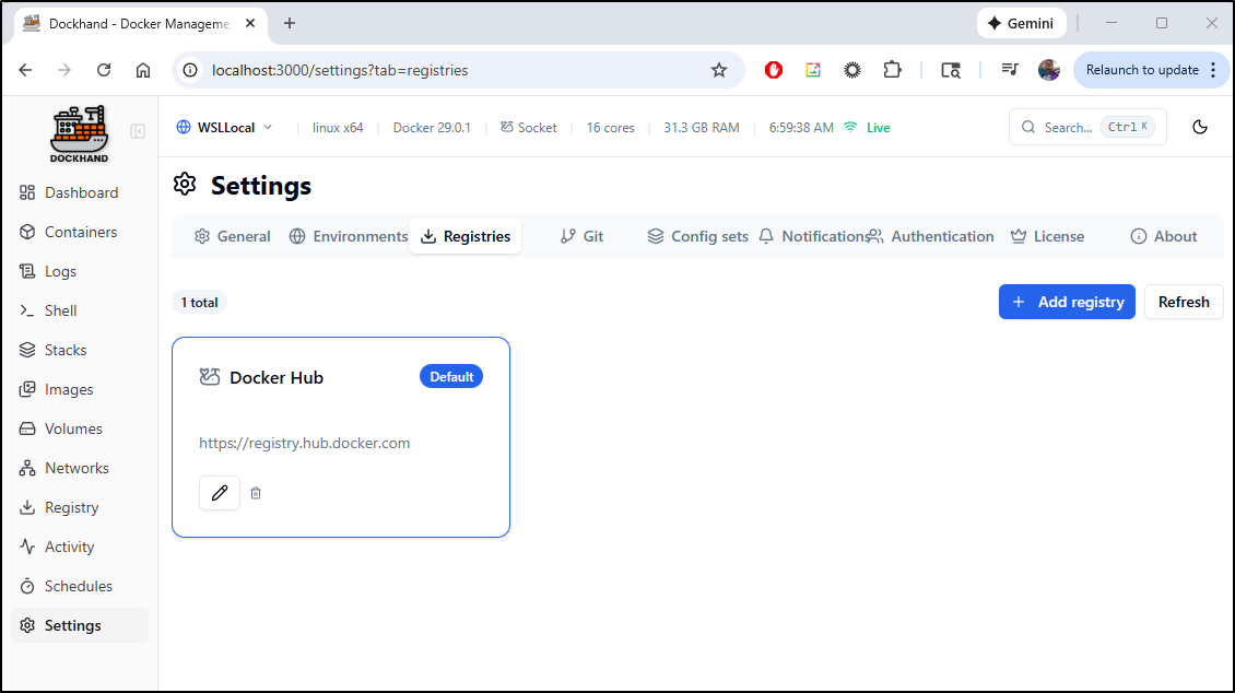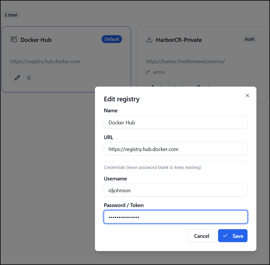 I then went to the Registries and clicked “edit” on Docker Hub to set my own creds