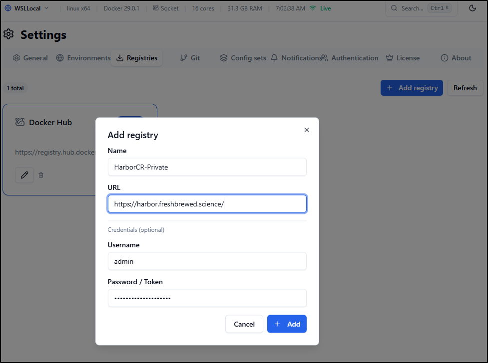 by default, it has Docker Hub, but let’s add our Harbor CR to it