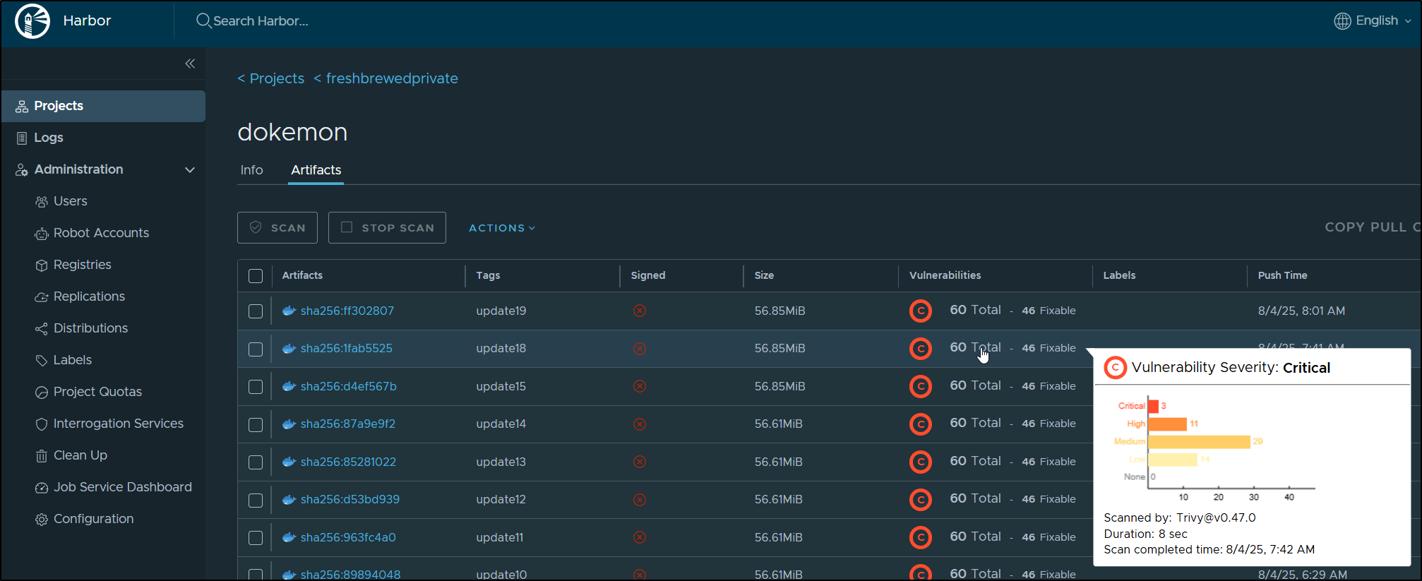 I can see the ones found via Aqua Trivy in Harbor:
