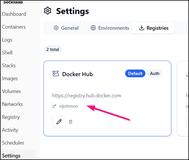 I can now see my username next to the key icon in “Docker Hub” in the registries