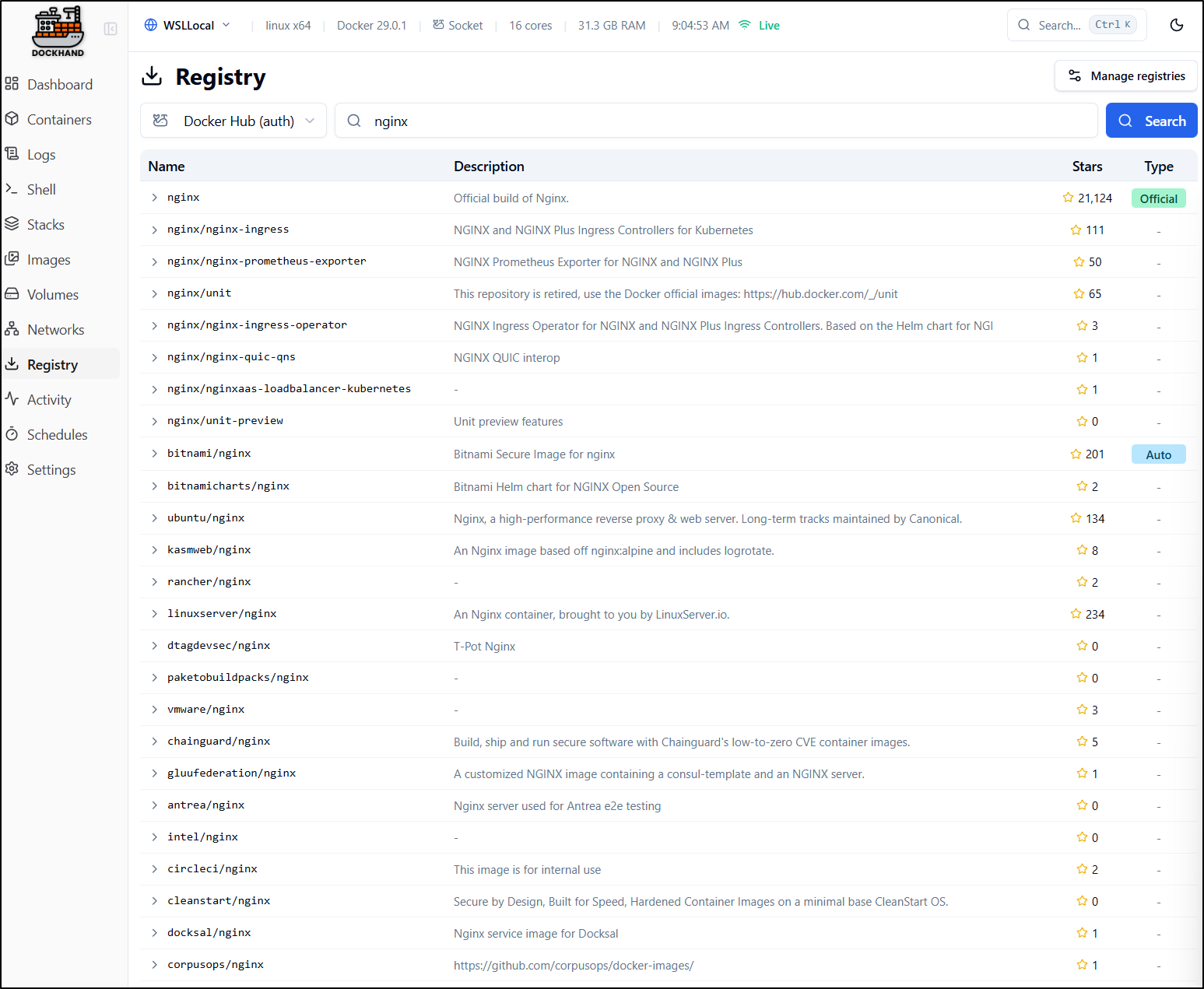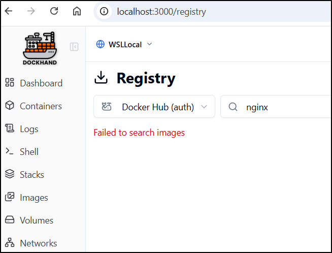 I noticed a “failed to search images” for nginx in Docker Hub.