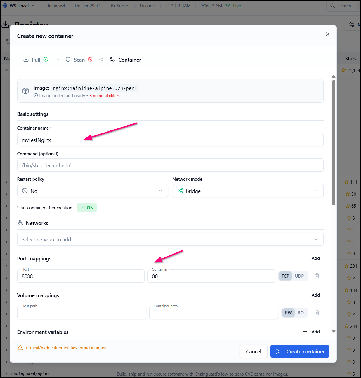 I chose a latest and clicked run. I kept it simple just giving a name and some port mappings