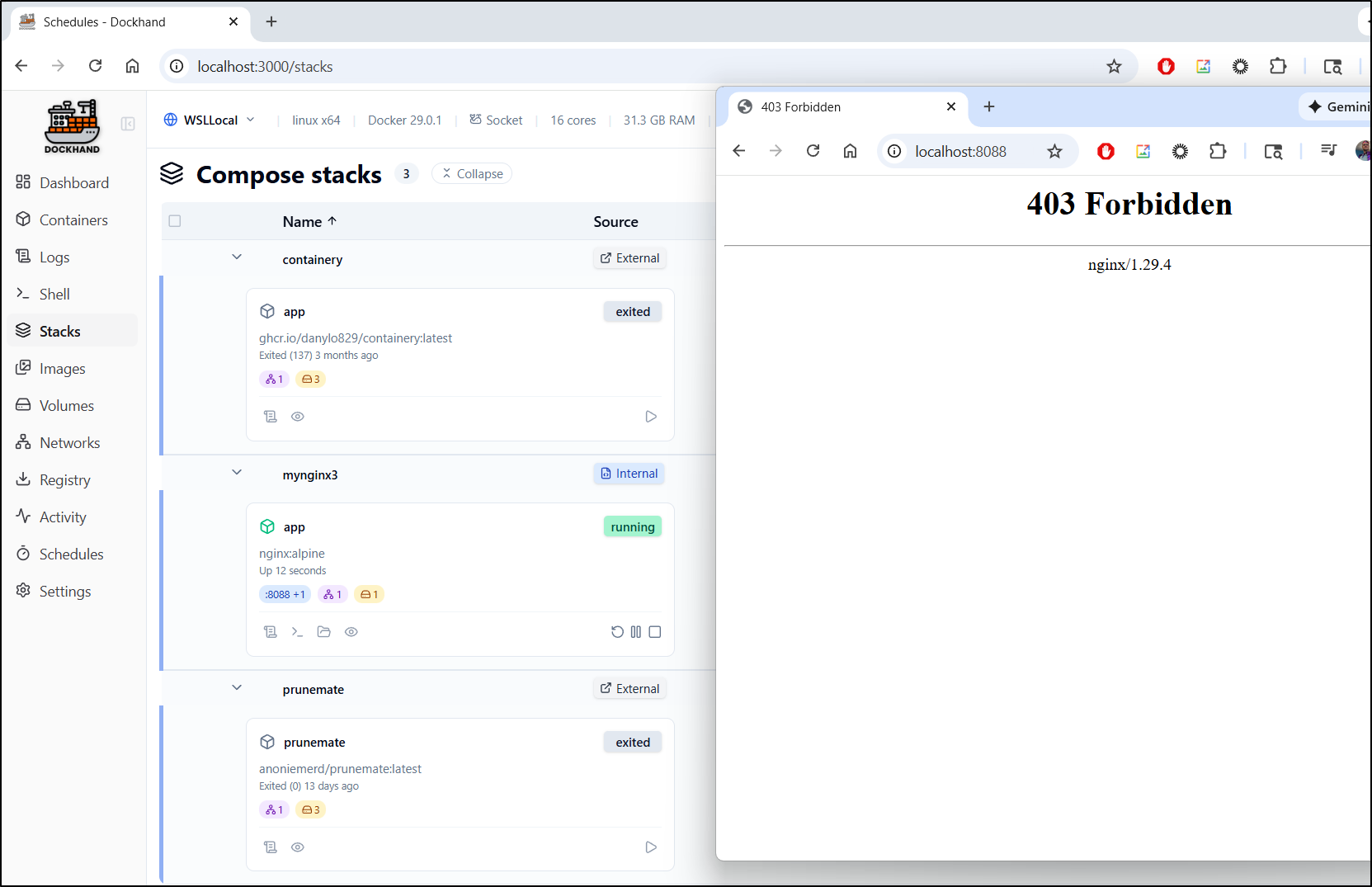 That launched just fine and I can see a 403 on root (it is a blank NGinx so i expect that - the fact we see “nginx/1.29.4” is the tell it is functioning)