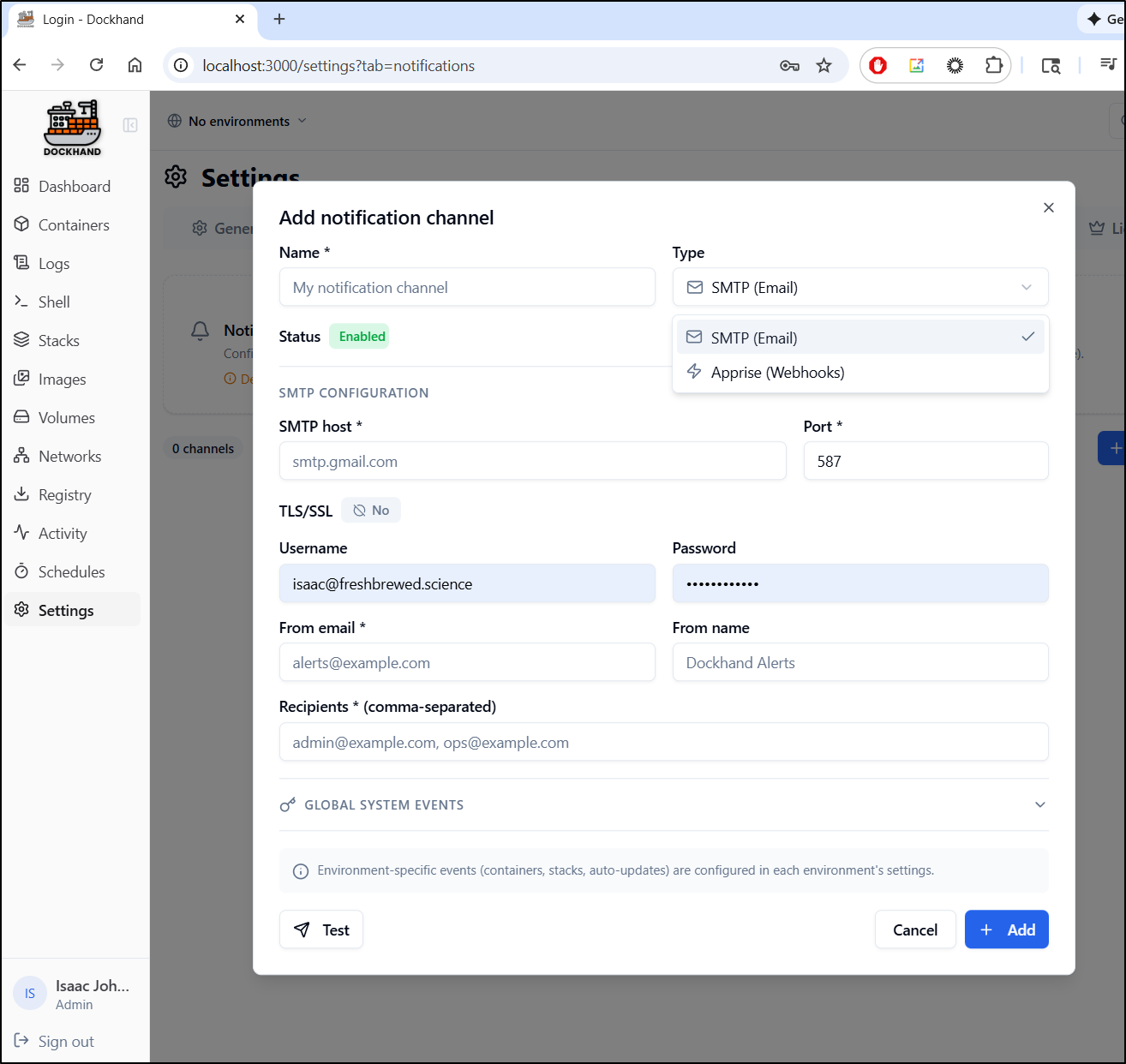 For Notifications, we can choose SMTP (email) or Apprise (Webhooks)
