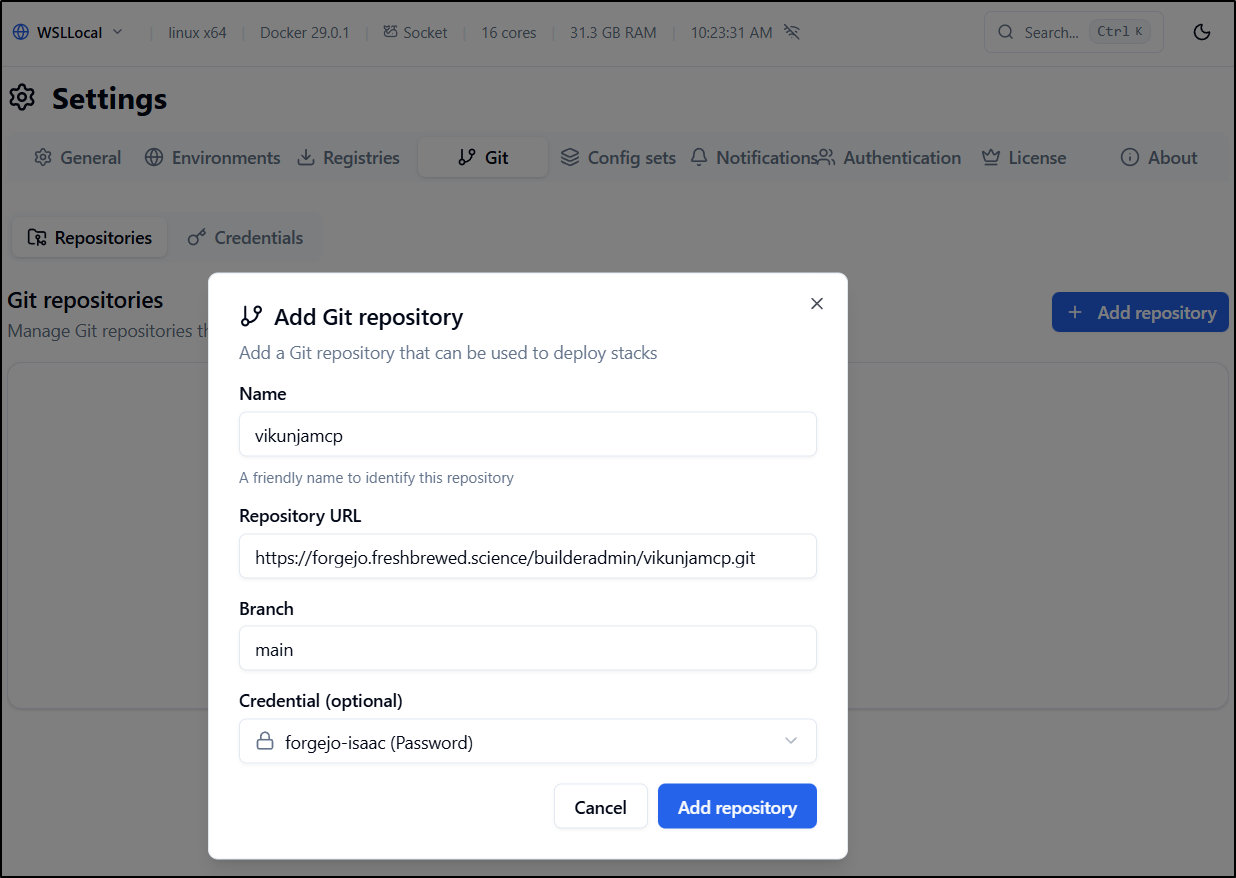 Now when launching a stack, I can use the GIT repo to fetch the docker compose