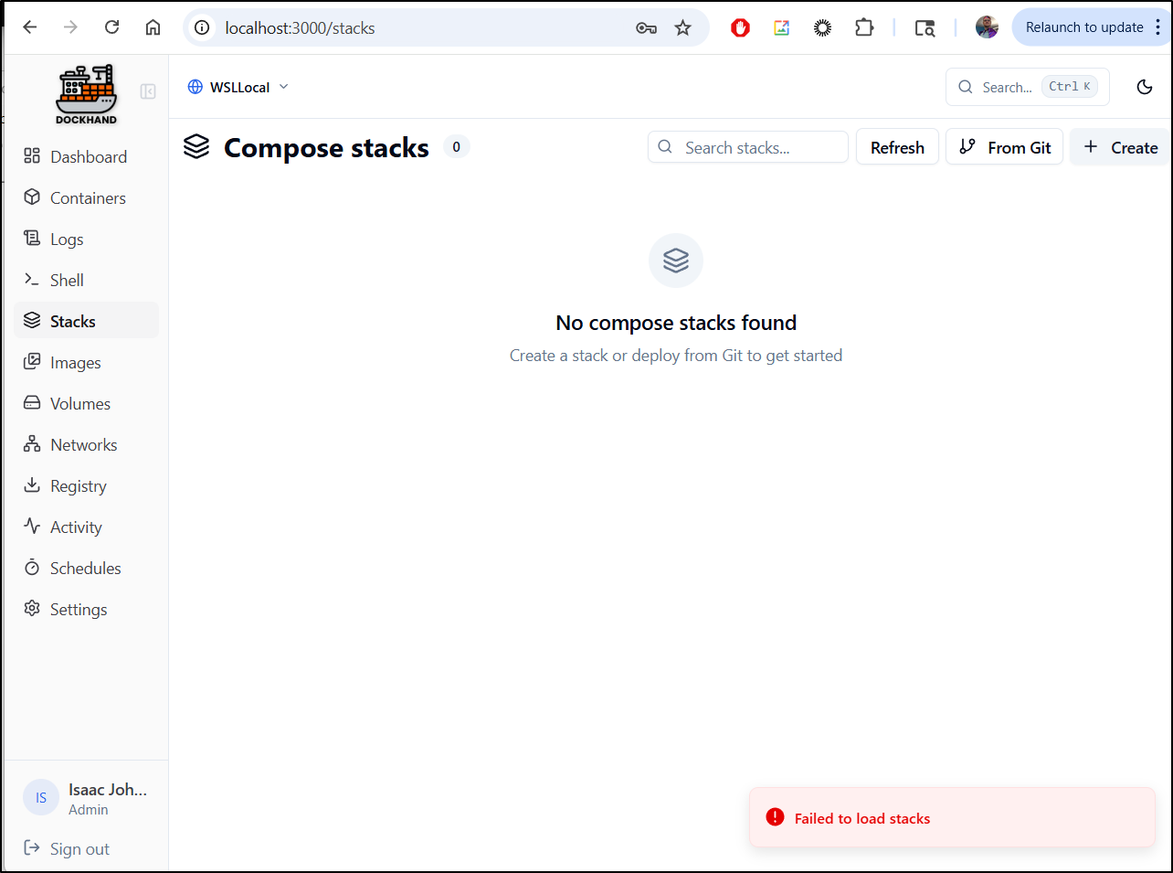 Stacks launch with Docker Compose are listed in “Stacks”