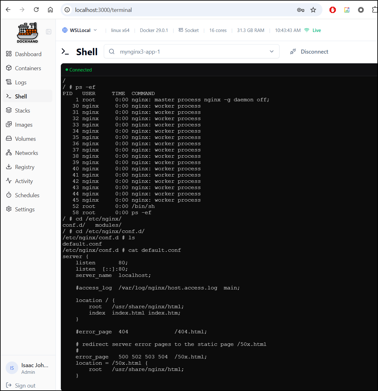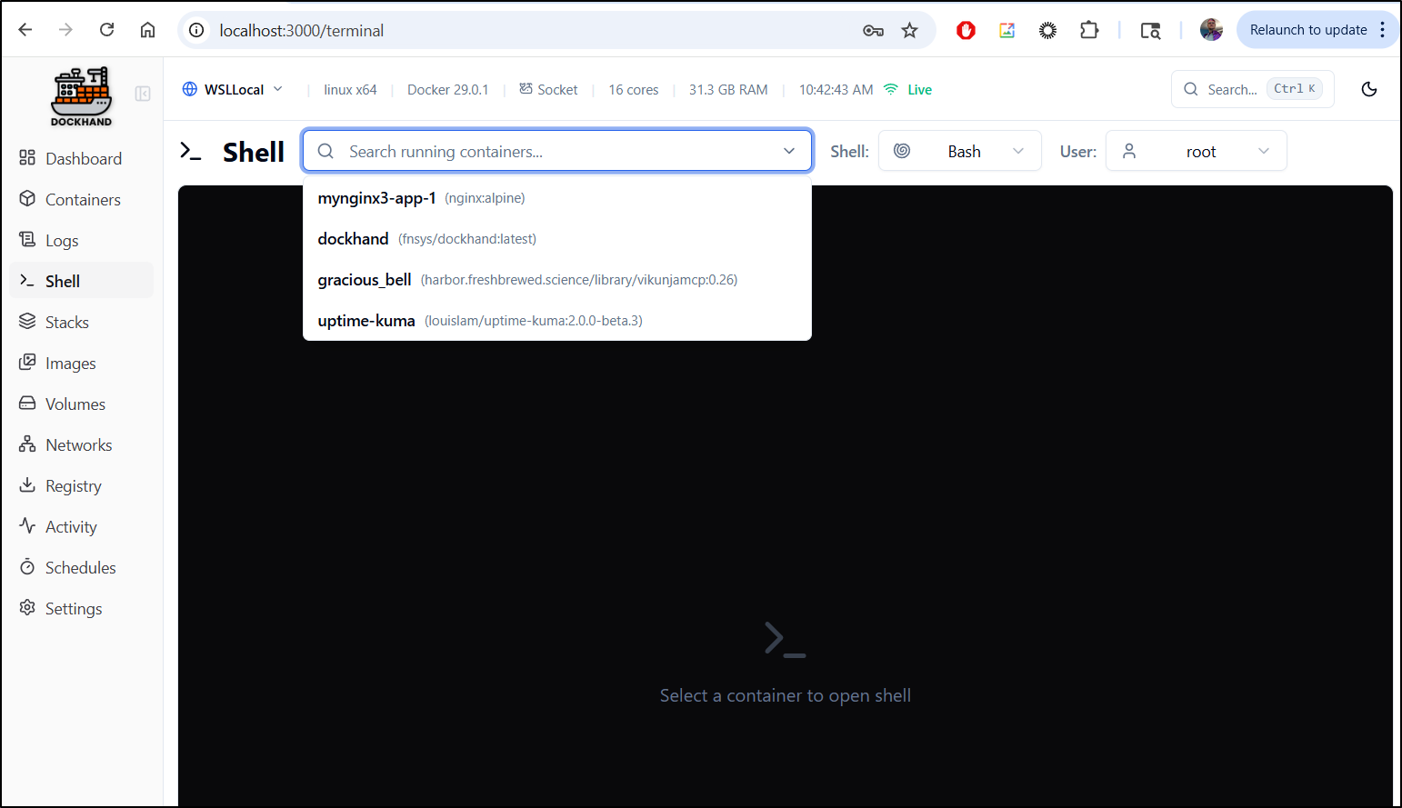 Another nice features of Dockhand is to just shell into a container.