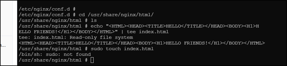 I had hoped to show a nice example of creating and updating the HTML page off the Nginx container, but they rendered the filesystem RO so I can’t: