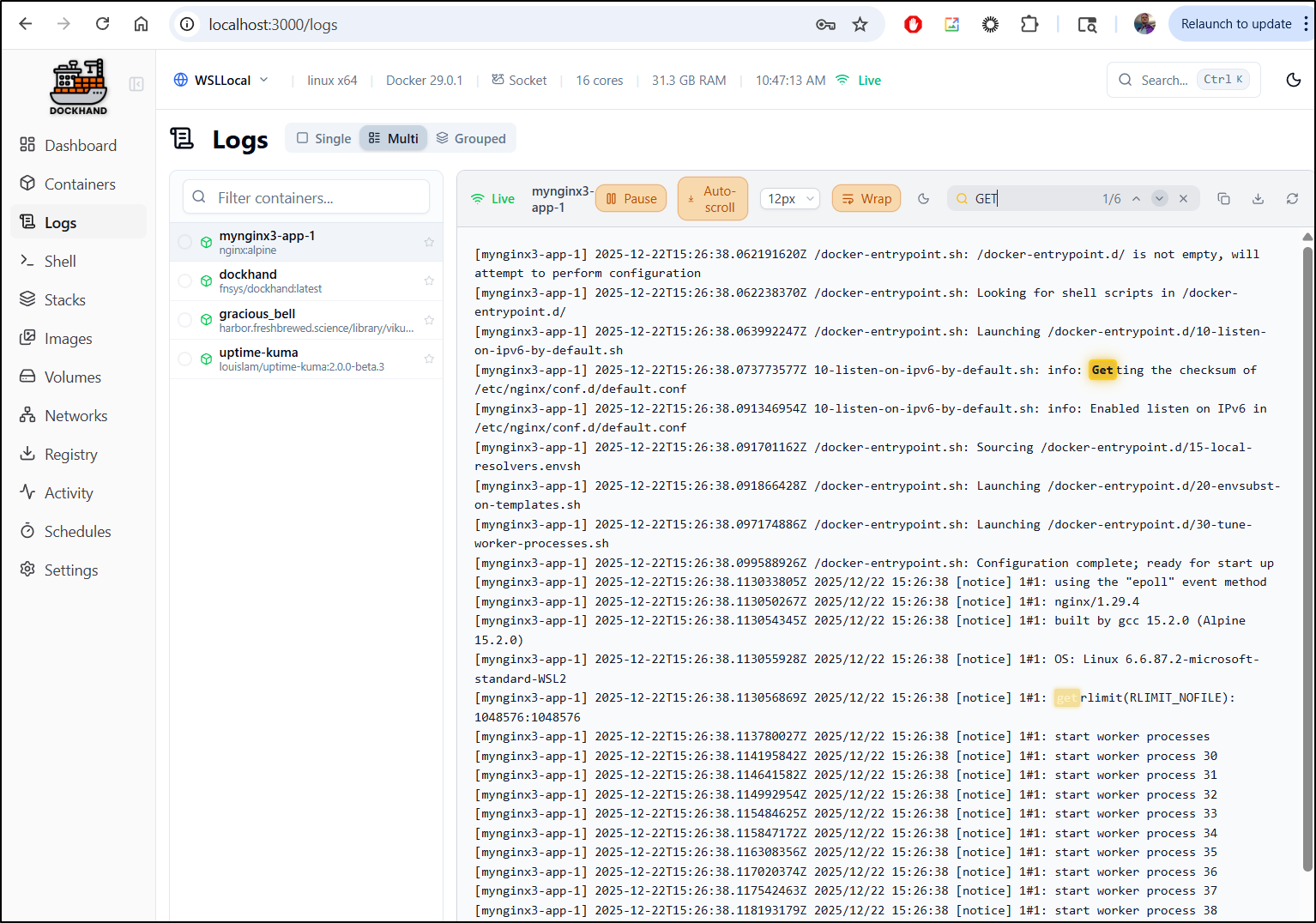 We can view recent logs of any container and follow them if desired.