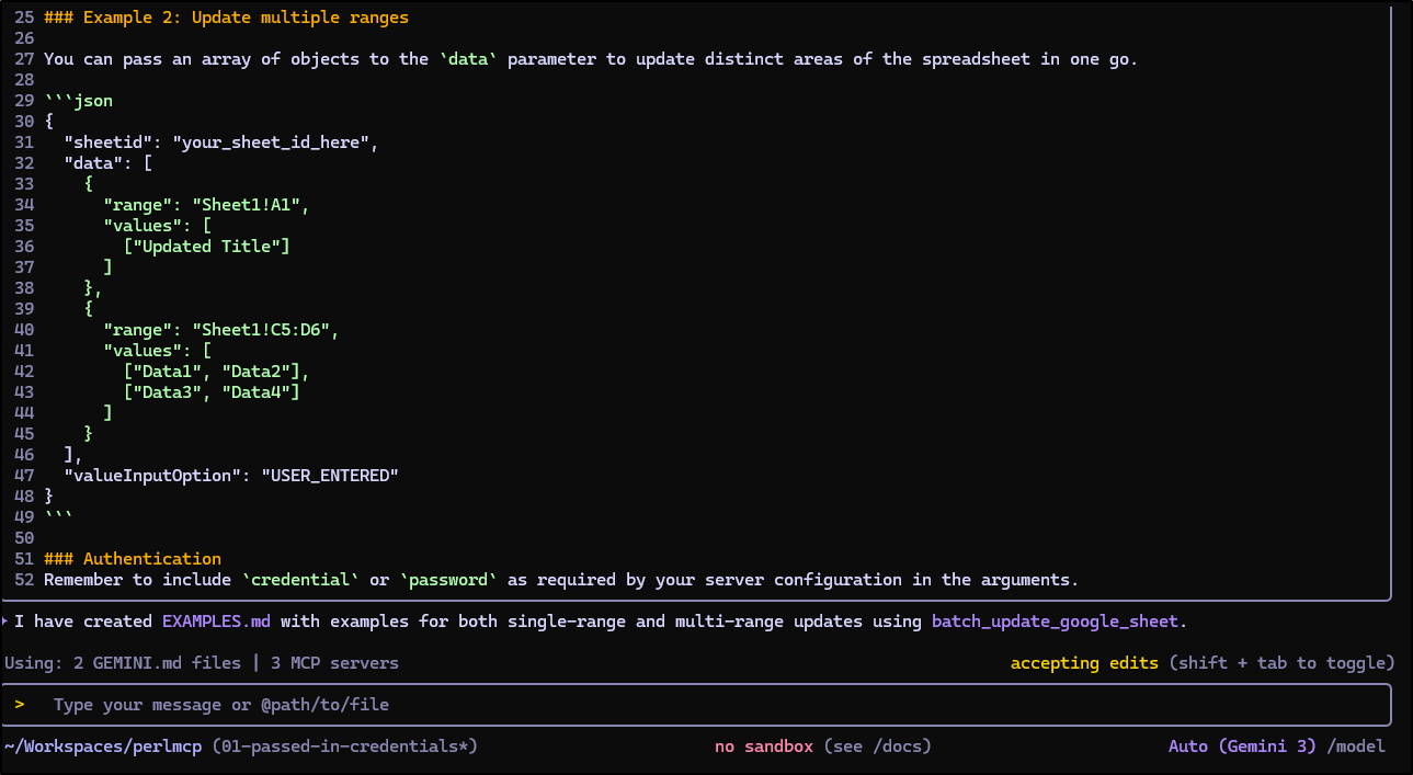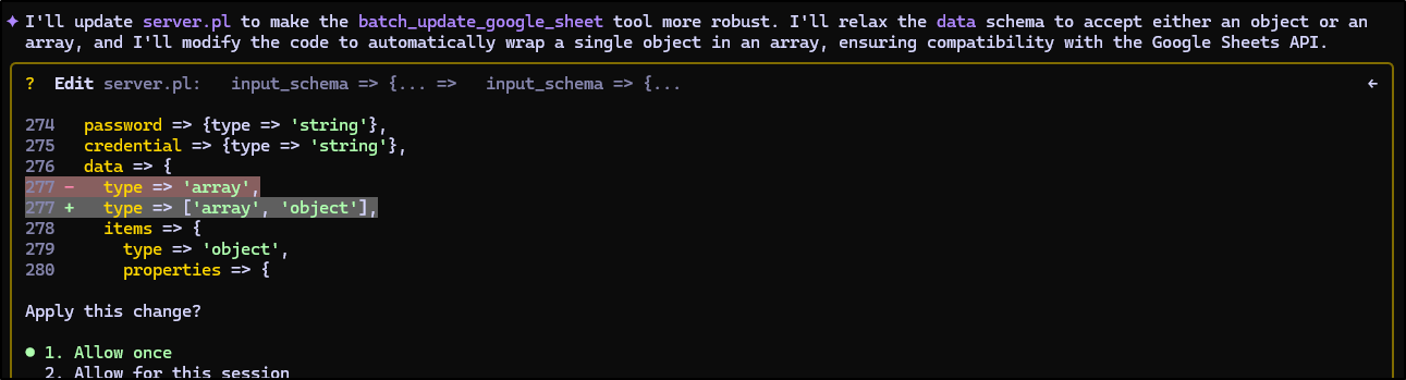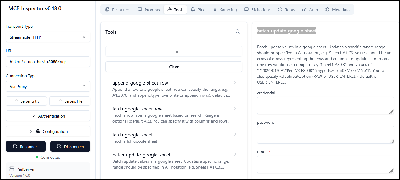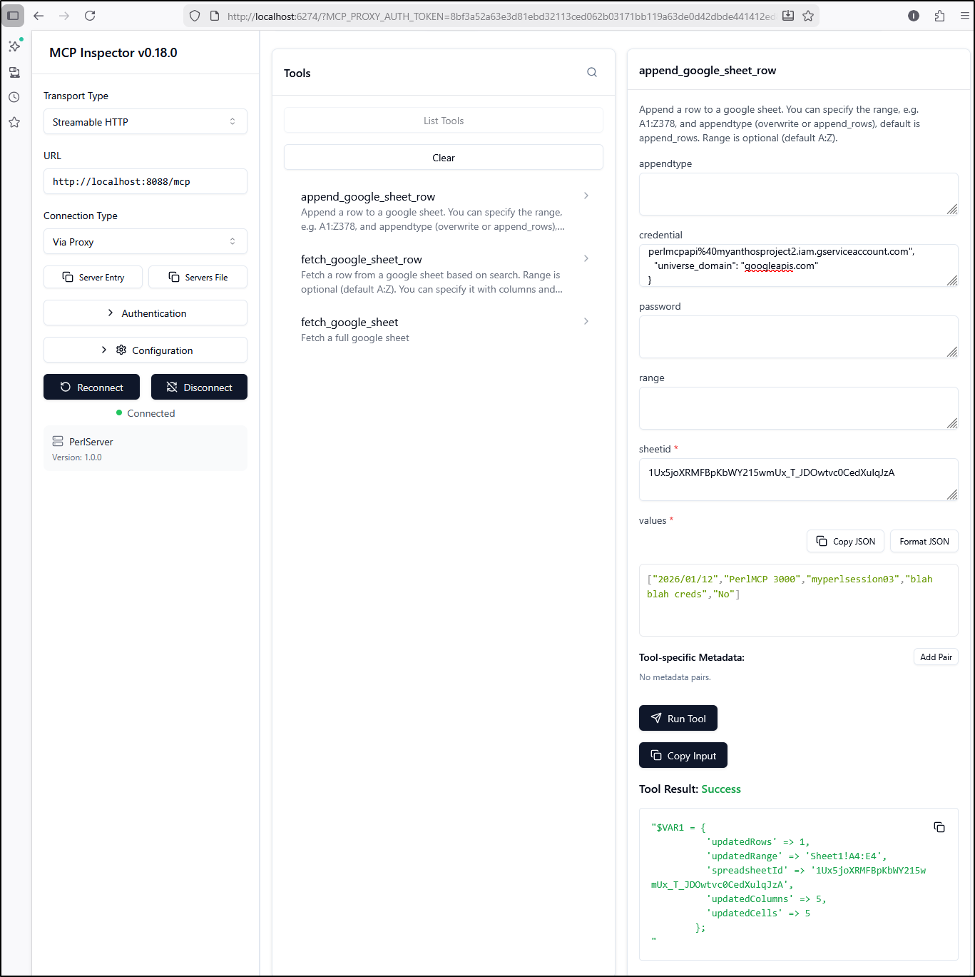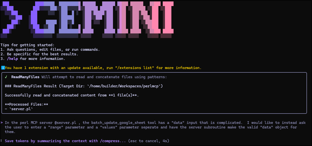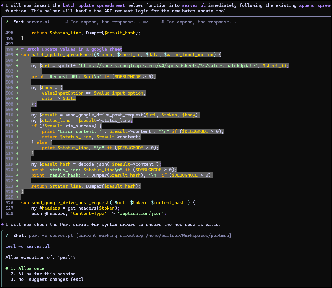 Earlier this week I posted my first article on PerlMCP which I pushed to Codeberg as a version1.0 tag. That code provides a Perl-based MCP server of type httpStreamable tied to a fixed GCP Service Account credential and just protected by a rotatable password.