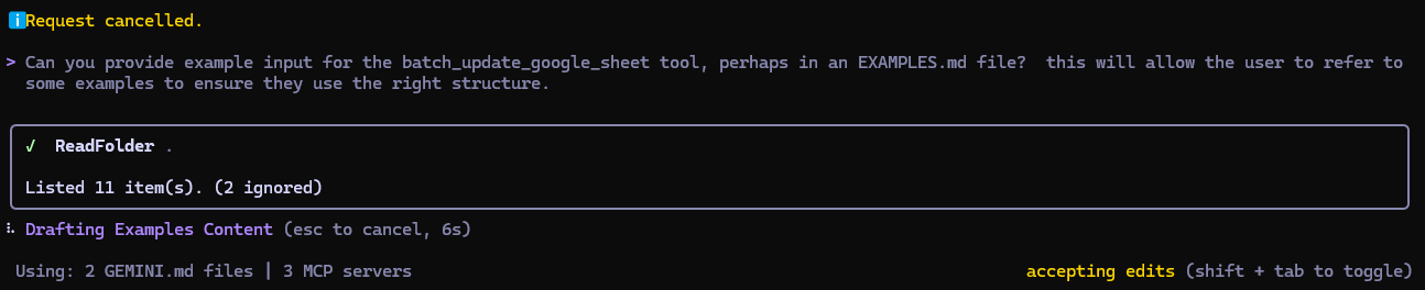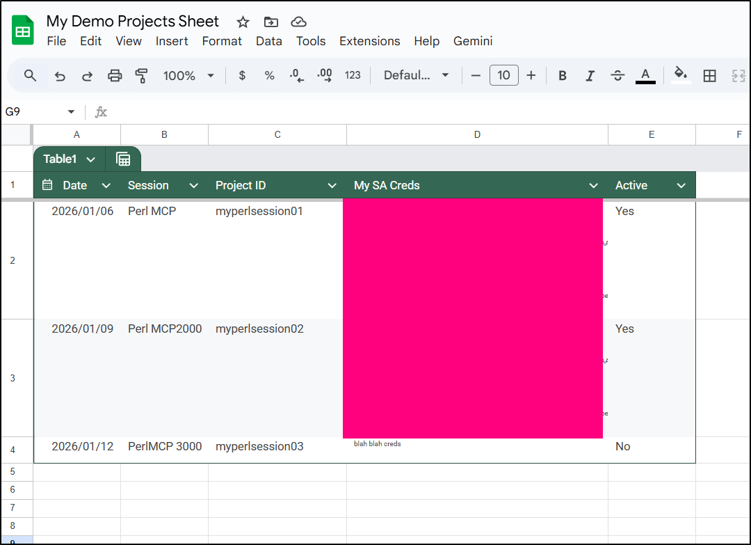 The problem I see is that it may not be the right implementation for everyone. Certainly, it has consequences if I ever published it to the Gemini Extensions Library (or similar). I would have toute-les-monde using my SA’s cred to bang at sheets; not sure I want that.